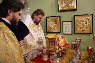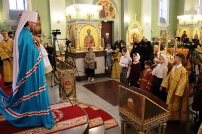 Митрополит Владимир поздравил молящихся с днем памяти Отцов Поместного Собора Церкви Русской 1917–1918 гг., причастников — с принятием Святых Христовых Таин и вручил сладкие подарки молящимся, подошедшим ко Кресту.