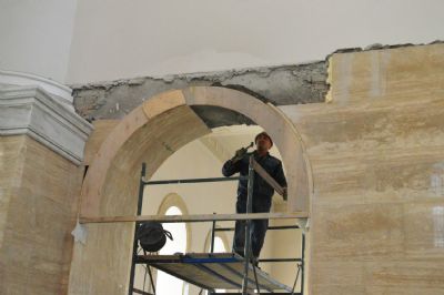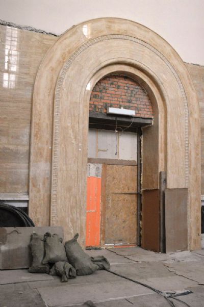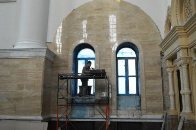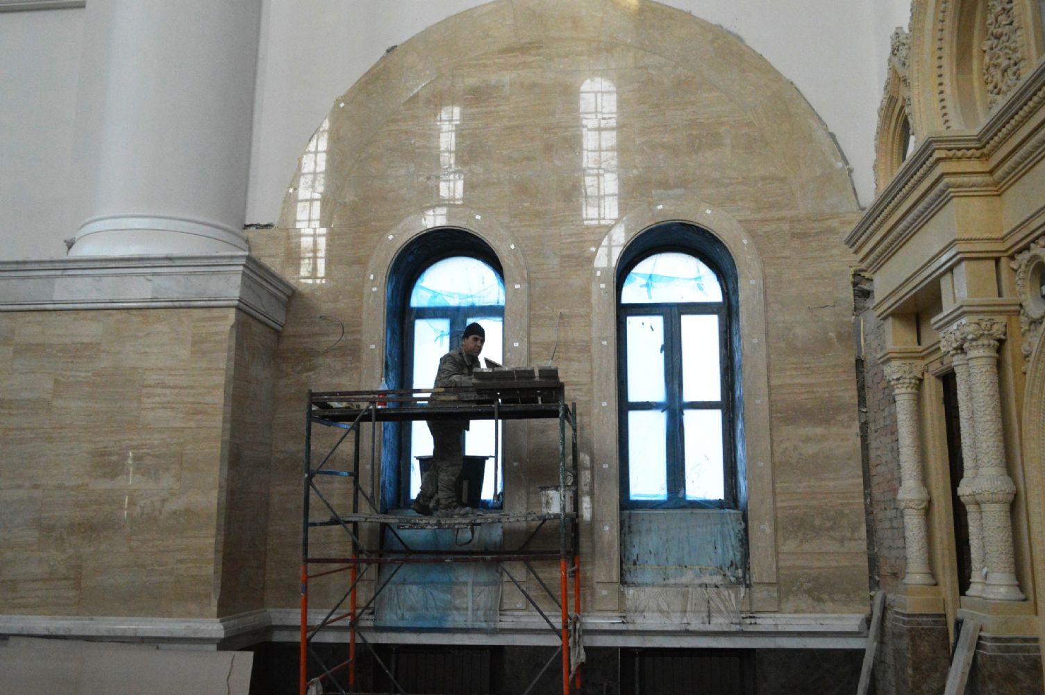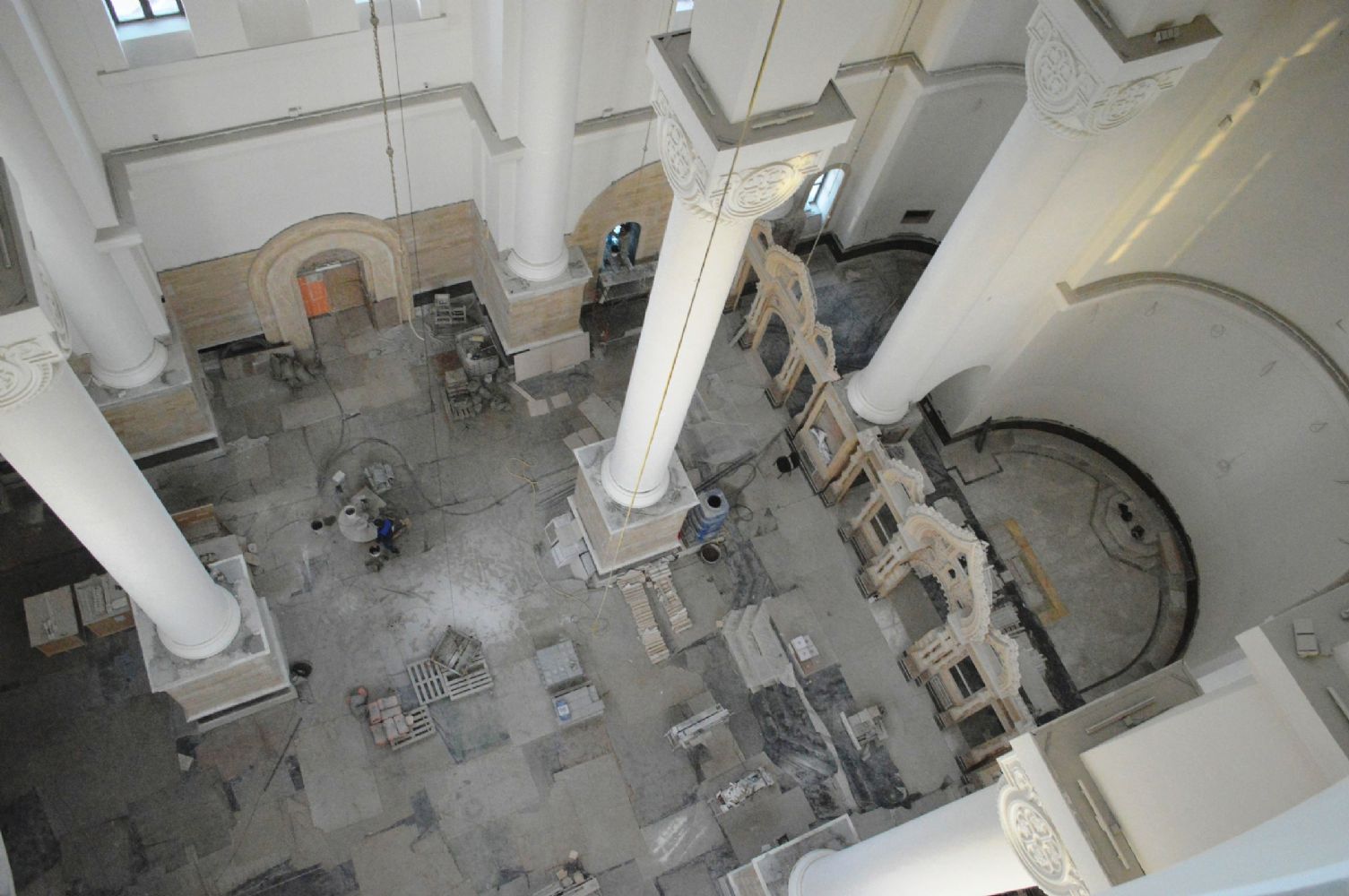 ООО «Гравитер» в настоящий момент продолжает отделку натуральным камнем стен, арок и входных групп. Также производится оштукатуривание и шпаклевание оконных откосов. Весь объем работ подрядчик планирует завершить в марте.