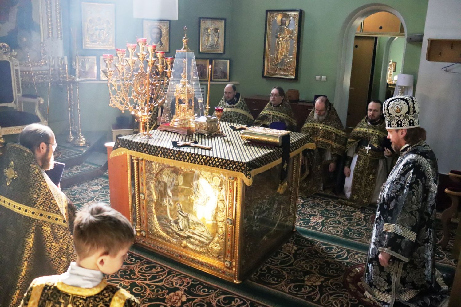 Его Высокопреосвященству сослужили: ключарь собора иерей Владимир Плотников, игумен Антоний (Каменчук), протоиерей Игорь Шевчук, иерей Максим Точуков, иерей Олег Селезнёв, иерей Иоанн Караман, иерей Дионисий Ищенко, иерей Михаил Тутаев.