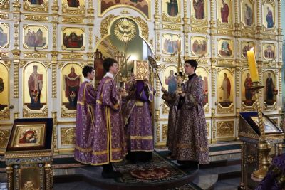 Его Высокопреосвященству сослужили: ключарь собора иерей Владимир Плотников, протоиерей Игорь Шевчук, иерей Максим Точуков, иерей Дионисий Ищенко.