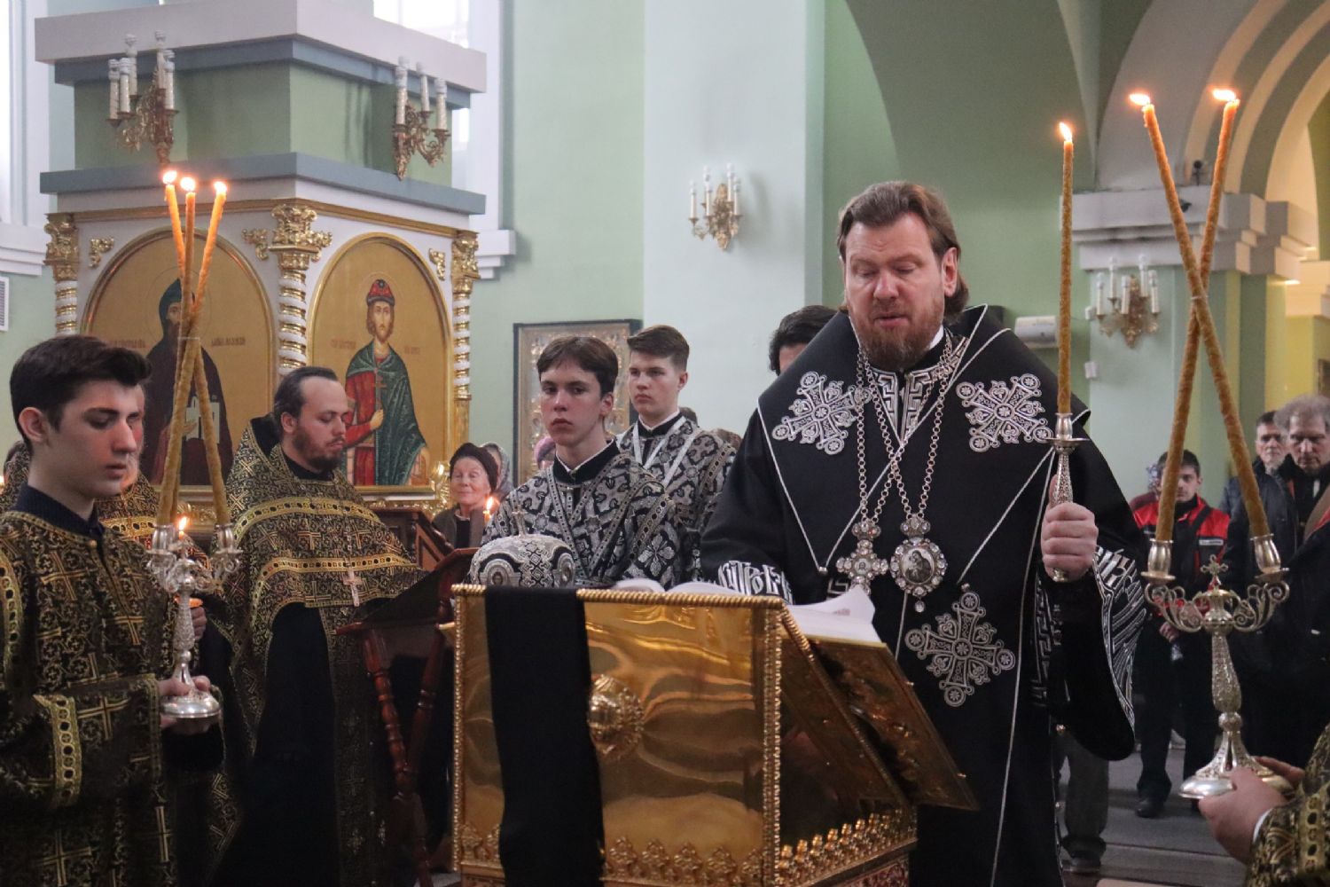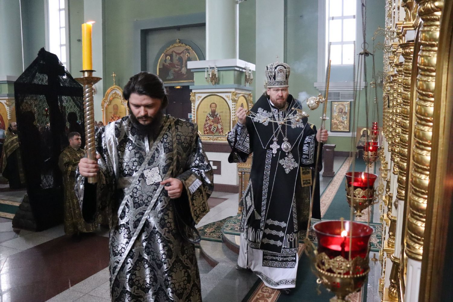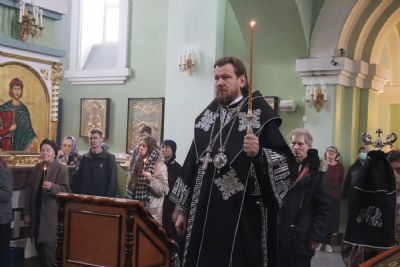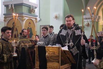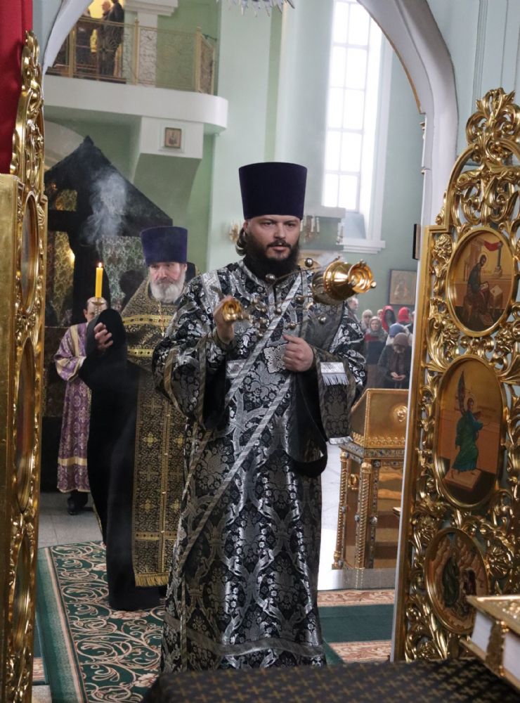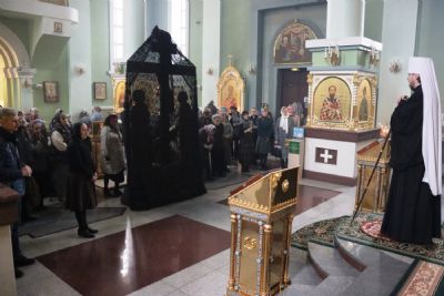 Его Высокопреосвященству сослужили: ключарь Покровского собора иерей Владимир Плотников, игумен Антоний (Каменчук), протоиерей Игорь Шевчук, иерей Максим Точуков, иерей Дионисий Ищенко.