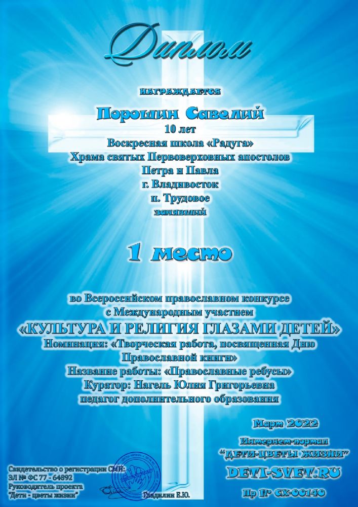 14 марта работы Порошина Савелия, Порошиной Серафимы, Ивановой Ольги, Ивановой Вероники и Завьялова Никиты были отправлены на конкурс. Порошин Савелий занял первое место.
