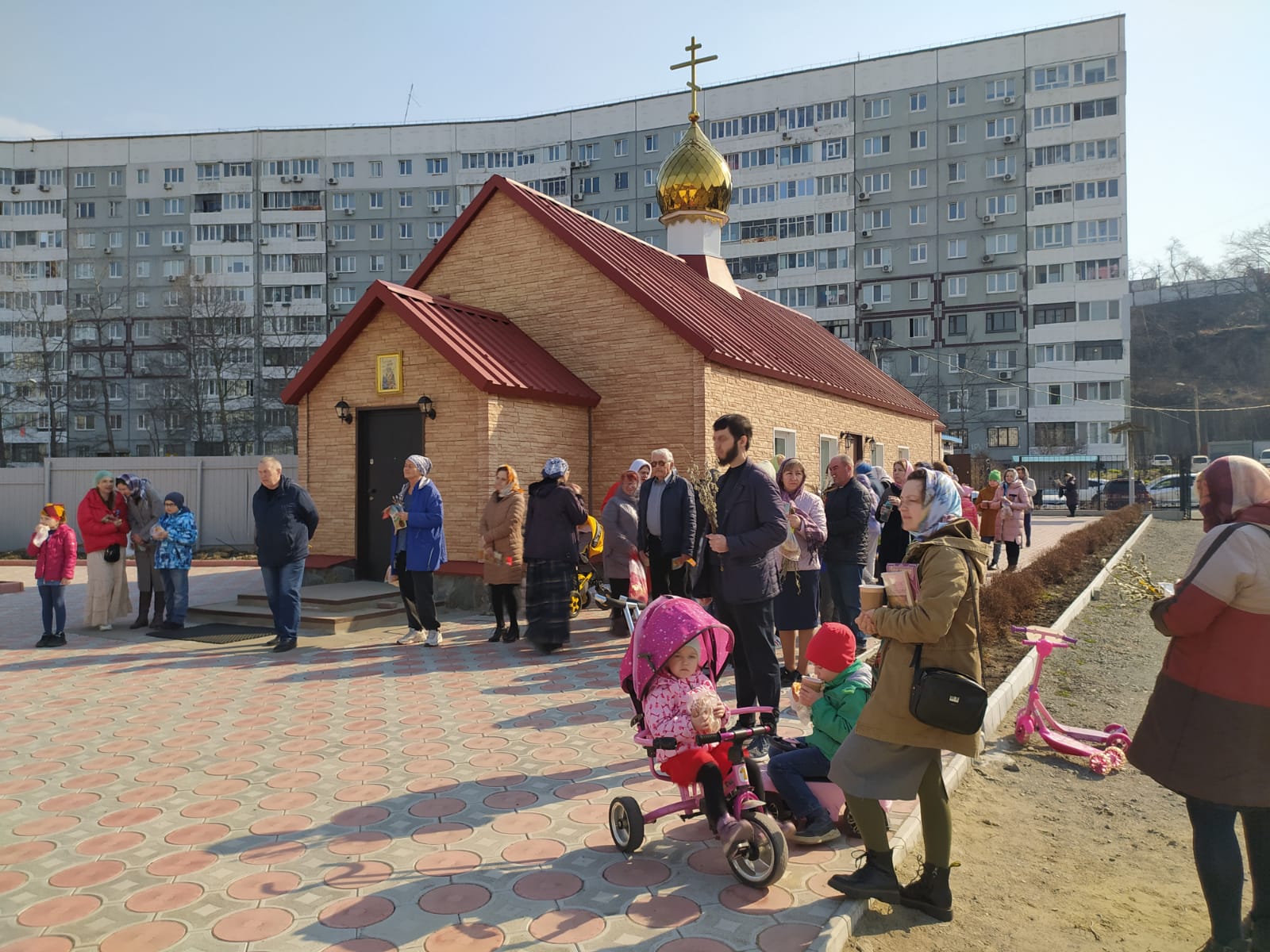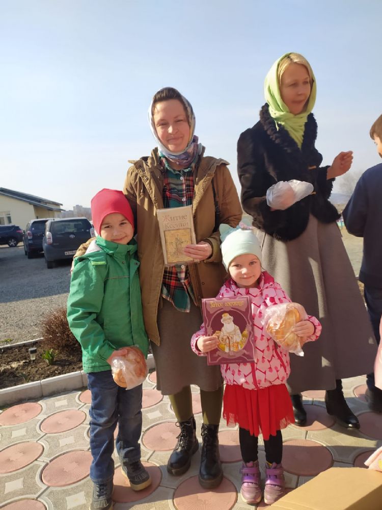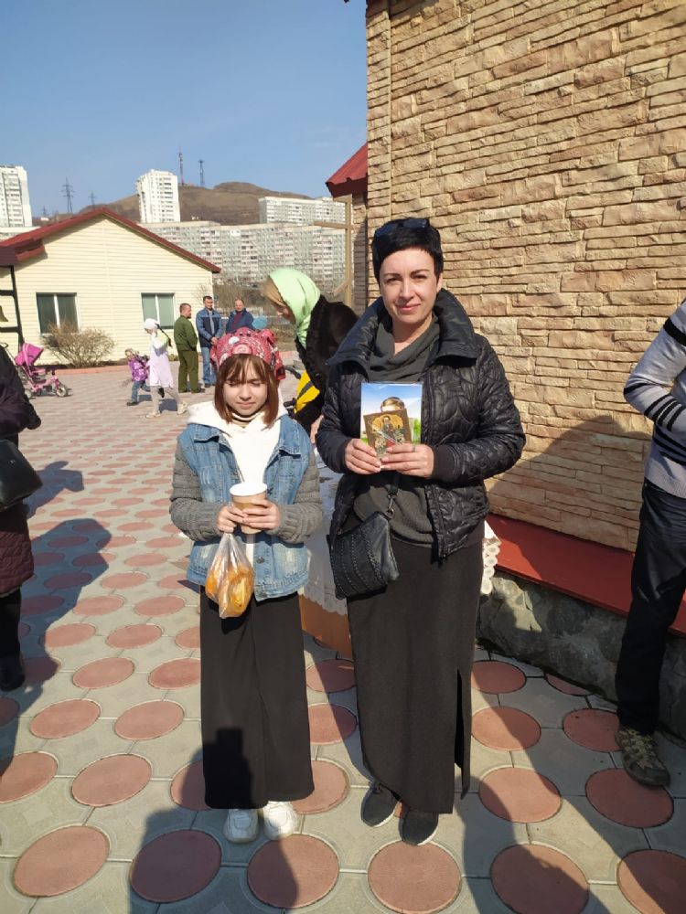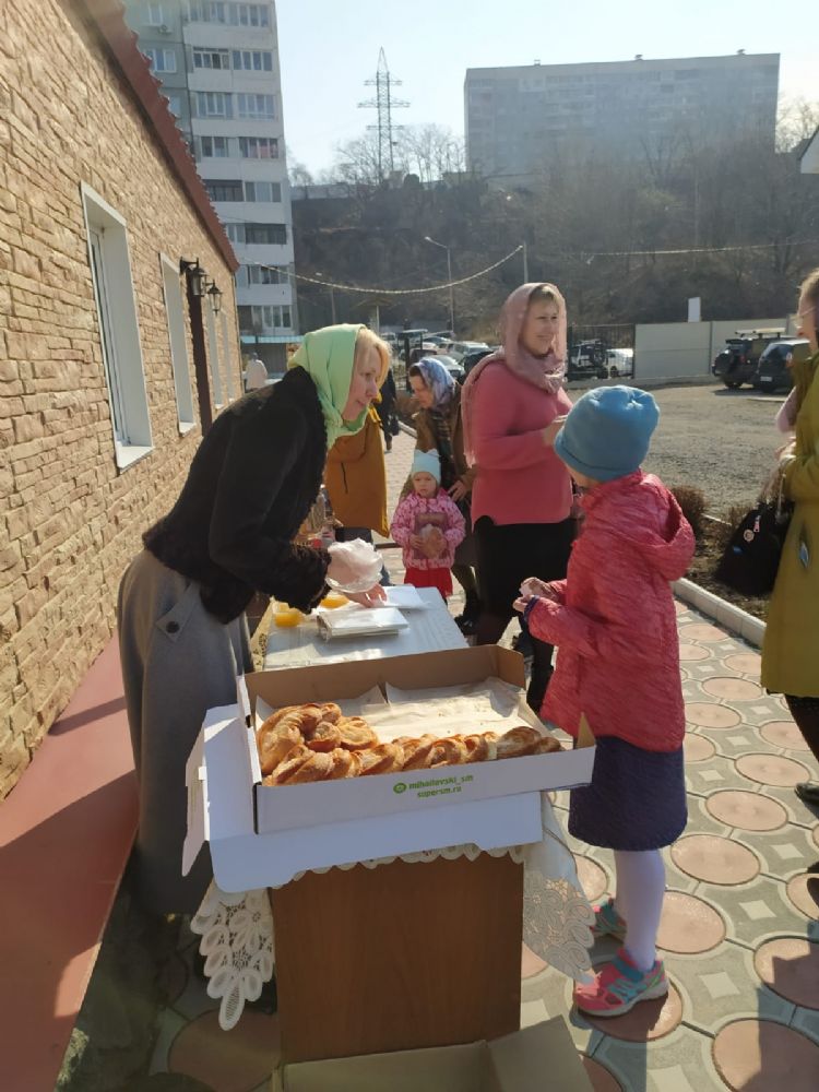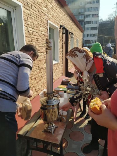 Владивосток. 17 апреля 2022 года, на приходе святого преподобного Сергия Радонежского состоялась благотворительная ярмарка «Святая Верба», на которой усердием волонтеров было организовано уличное чаепитие, благотворительная раздача духовной литературы и освященной вербы.