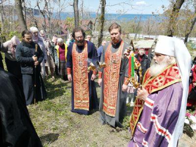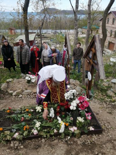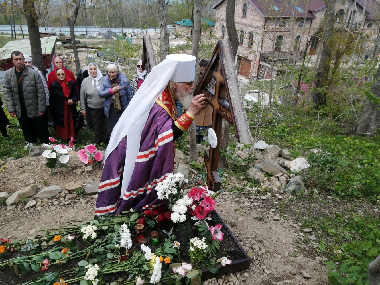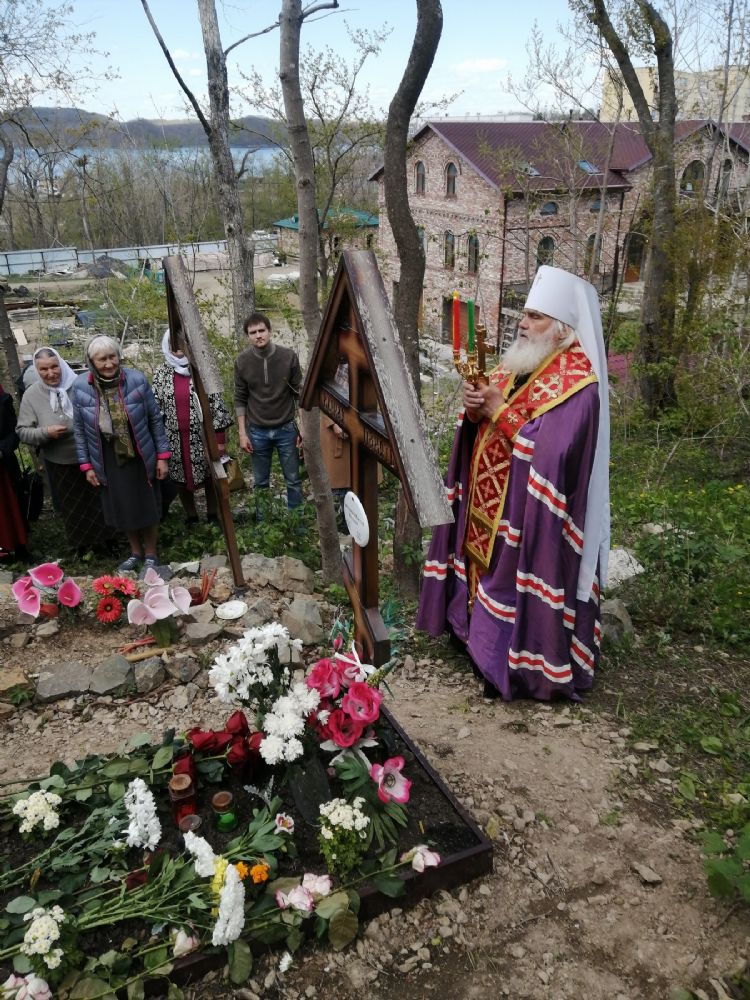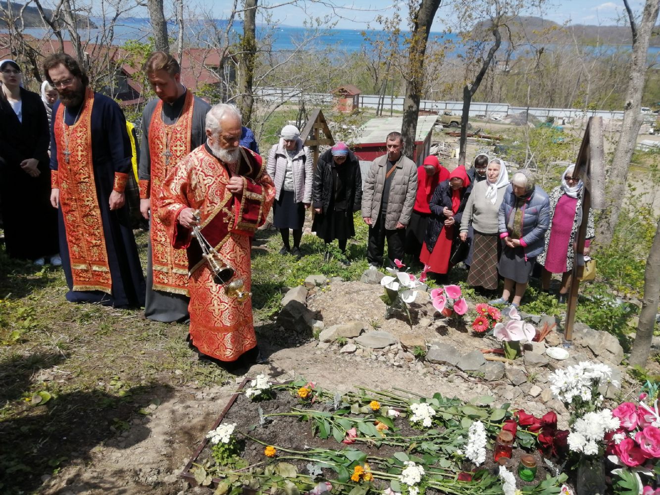 Владивосток. 8 мая 2022 года, в неделю 3-ю по Пасхе, святых жен-мироносиц, митрополит Вениамин (Пушкарь) совершил пасхальную панихиду на месте упокоения протоирея Виктора Жильцова.