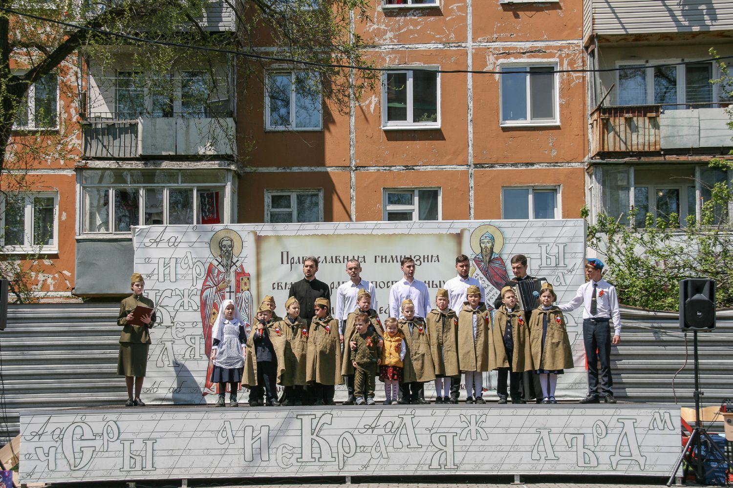 8 мая на приходе храма Кирилла и Мефодия прошел школьный парад «Песни и строя». Прихожане, родители и гости гимназии стали участниками замечательного праздника, подготовленного гимназистами. И сами прошли с фотографиями «Бессмертного полка» и выстоялись на крыльце храма.