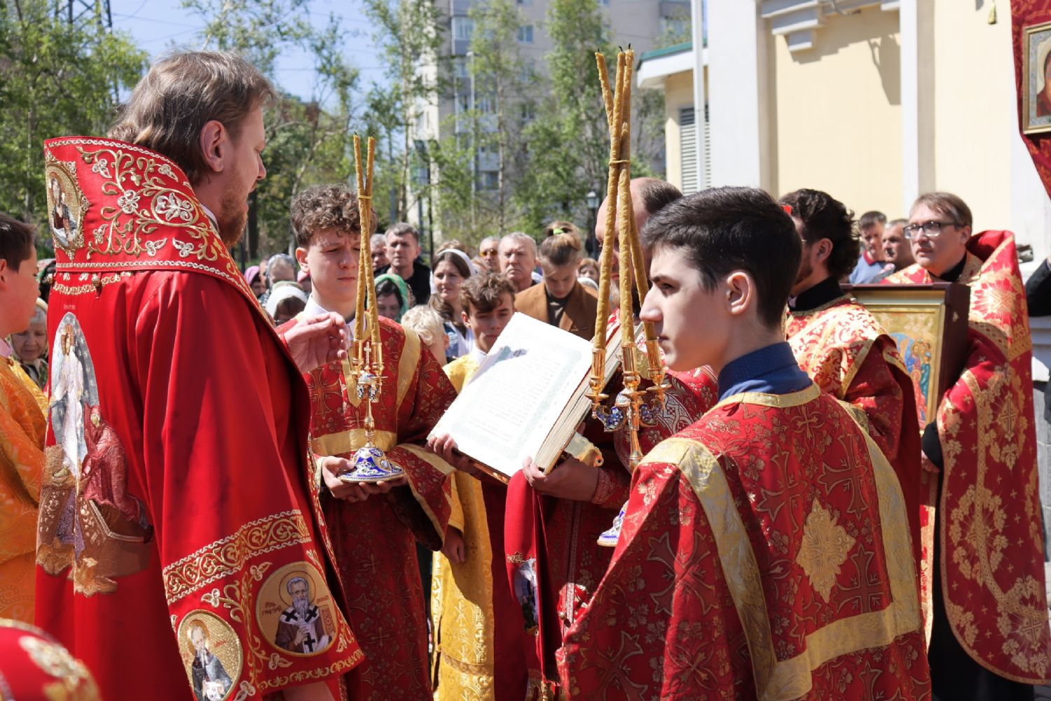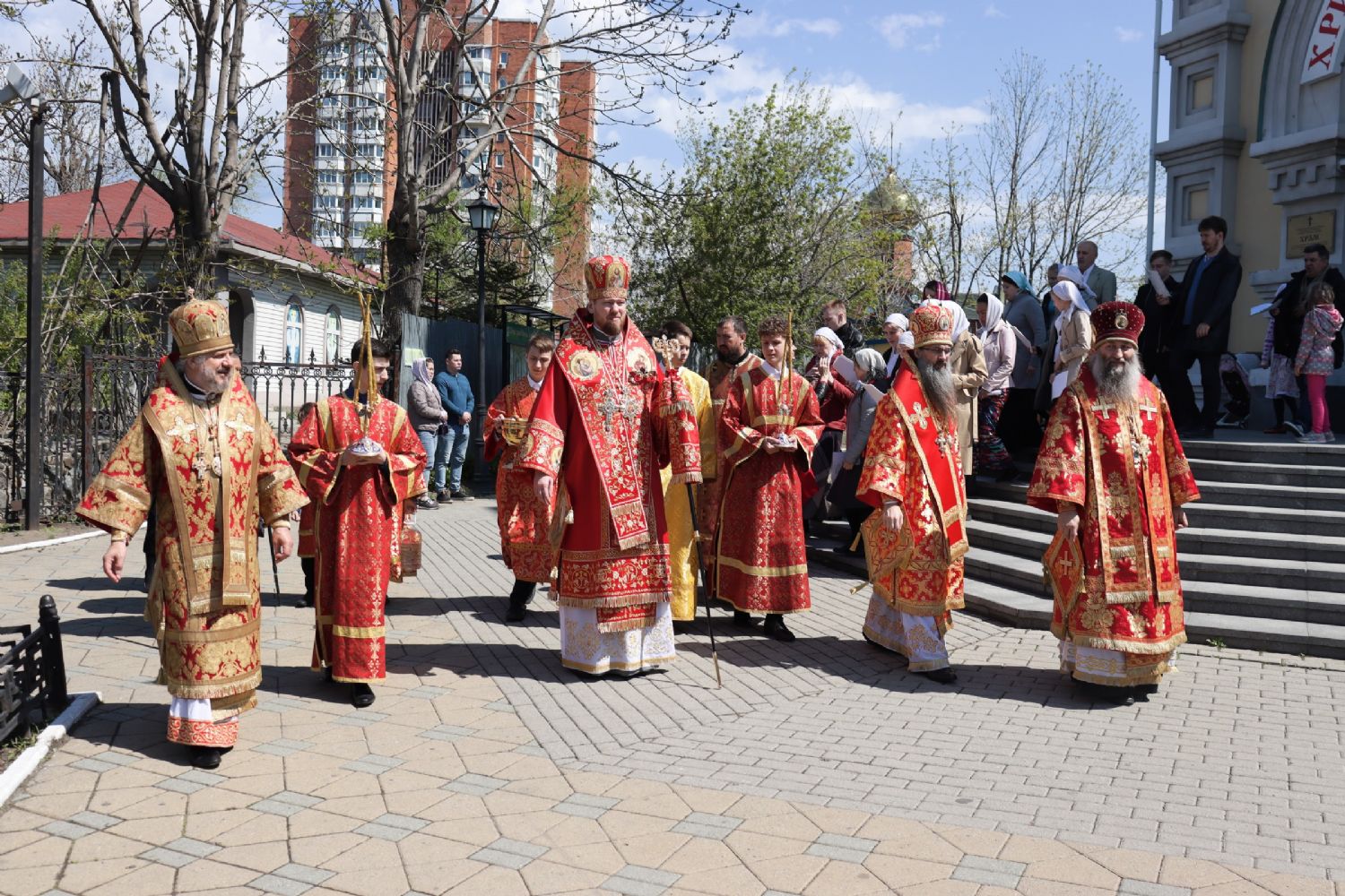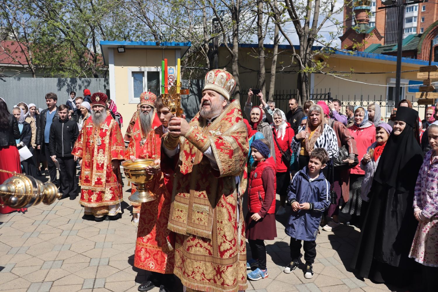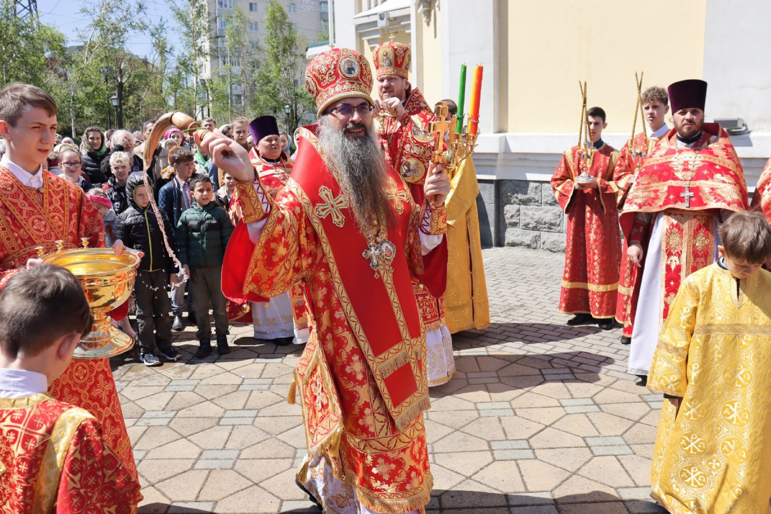 Владивосток. 15 мая 2022 года, в Неделю 4-ю по Пасхе, о расслабленном, и день празднования перенесения мощей благоверных князей Российских Бориса и Глеба, во Святом Крещении Романа и Давида, митрополит Владивостокский и Приморский Владимир в сослужении епископа Уссурийского Иннокентия, викария Владивостокской епархии, епископа Находкинского и Преображенского Николая, епископа Арсеньевского и Дальнегорского Гурия совершил Божественную литургию в Покровском соборе.