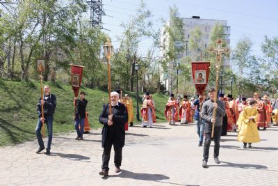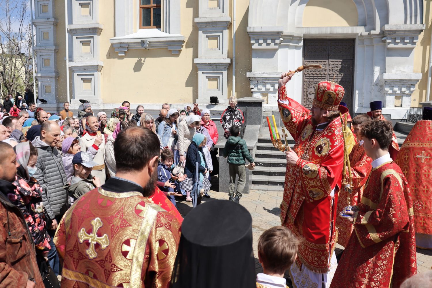 По заамвонной молитве архипастыри возглавили Пасхальный крестный ход вокруг храма, затем митрополит Владимир вознес молитву святым благоверным князьям Российским Борису и Глебу и было совершено славление святым.