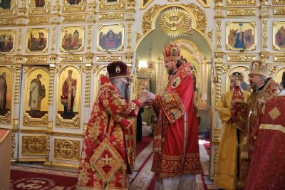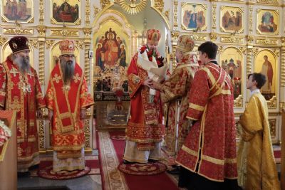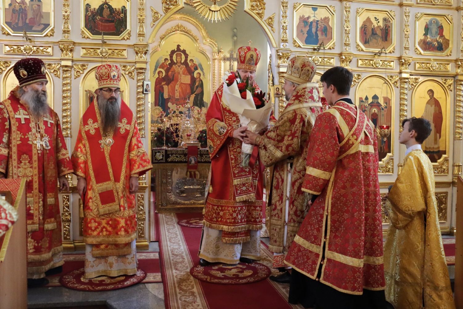 По отпусте литургии епископ Находкинский и Преображенский Николай и епископ Арсеньевский и Дальнегорский Гурий поздравили главу Приморской митрополии с продолжающимся празднованием Святой Пасхи и преподнесли букеты цветов.