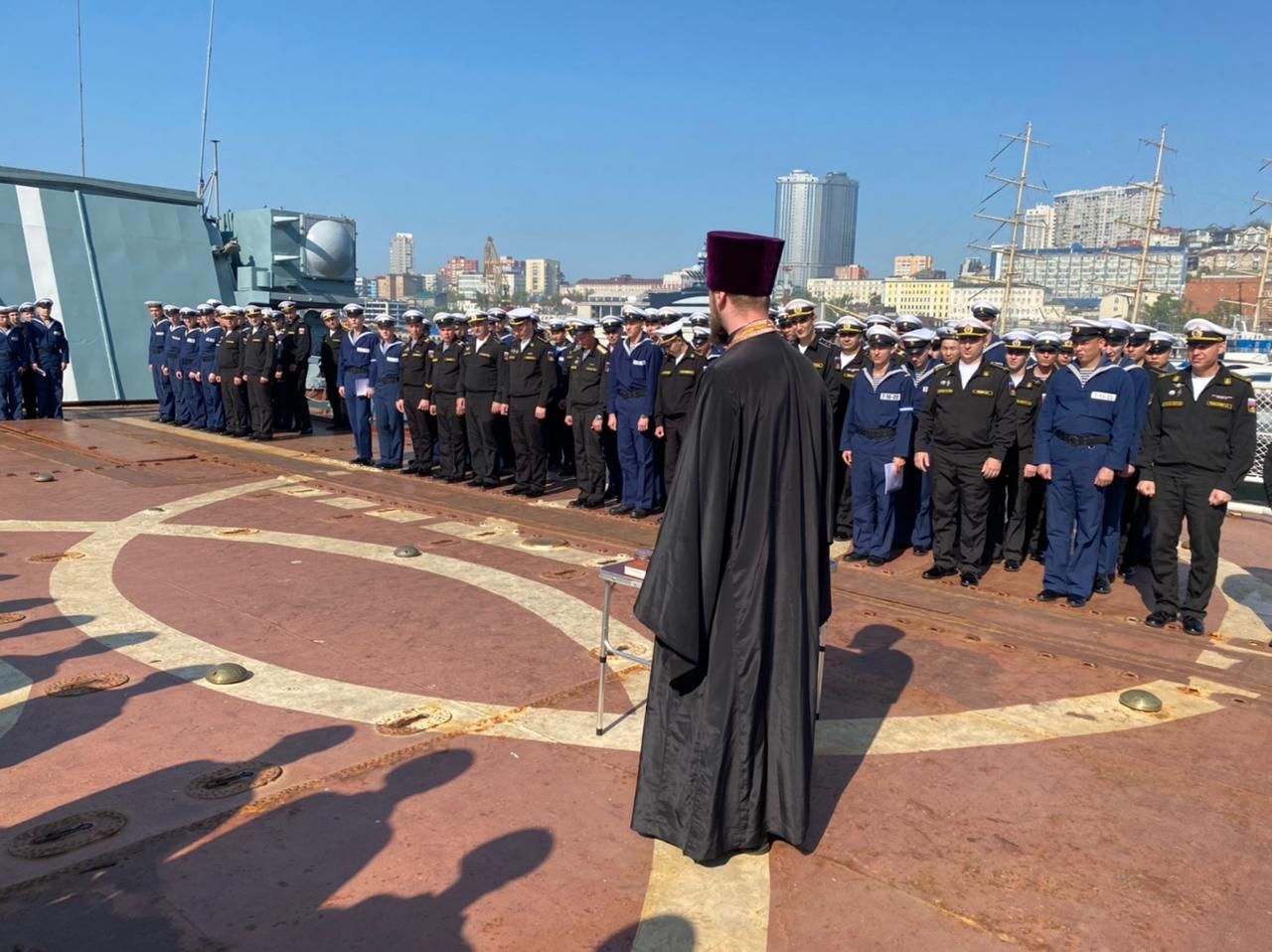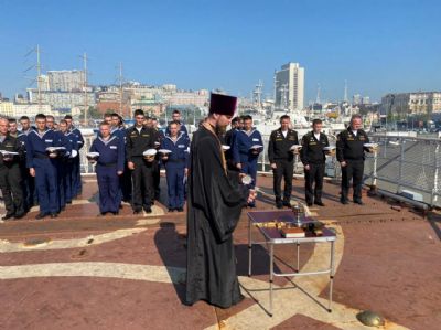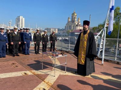 Владивосток. 19 мая 2022 года руководитель отдела по взаимодействию с Вооруженными Силами иерей Даниил Есаков совершил молебен для личного состава большого противолодочного корабля «Адмирал Пантелеев» перед убытием на учения.