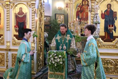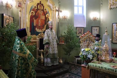 В завершение богослужения ключарь Покровского собора иерей Владимир Плотников поздравил владыку Владимира с праздником Пятидесятницы и преподнес букет цветов.
