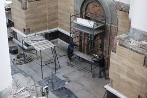 Представитель ООО «Гравитер» прокомментировал ход работ по укладке мрамора на лестницах и площадках в храме. Отделка площадки клироса на отметке +7,250 и внутренних лестниц с отметки 0,000 до -5,400 завершена. Завершается отделка балкона на отметке +23,250.