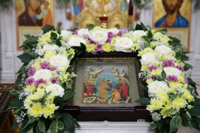 В завершение богослужения епископ Николай обратился к митрополиту Владимиру со словами приветствия, поздравил с неделей Всех святых и преподнес букет цветов.