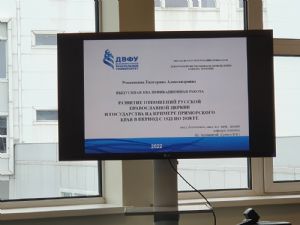 Владивосток. 29 июня состоялась защита ВКР по направлению теология в Школе искусств и гуманитарных наук Дальневосточного федерального университета. Работу государственной комиссии (ГЭК) по теологии возглавила Царёва Надежда Александровна – доктор философских наук, профессор кафедры гуманитарных и социально-экономических дисциплин Тихоокеанского высшего военно-морского училища имени С.О. Макарова. В составе ГЭКа присутствовали епископ Уссурийский Иннокентий, канд. богословия, к. ист. н., ученый секретарь Совета по развитию теологического образования в Приморской митрополии, Здор А. В., к. ф. н., заведующая кафедрой теологии ДФиР ШИГН ДВФУ, Пишун С. В. профессор, д. философ. н., иерей Дионисий Гордеев, старший преподаватель кафедры теологии, Солоненко Л. В. к. фил. н., ученый секретарь Центра подготовки церковных специалистов.