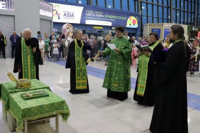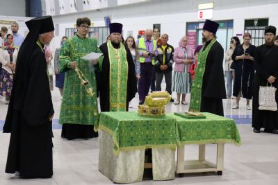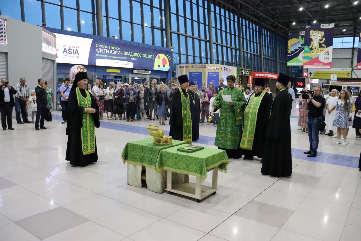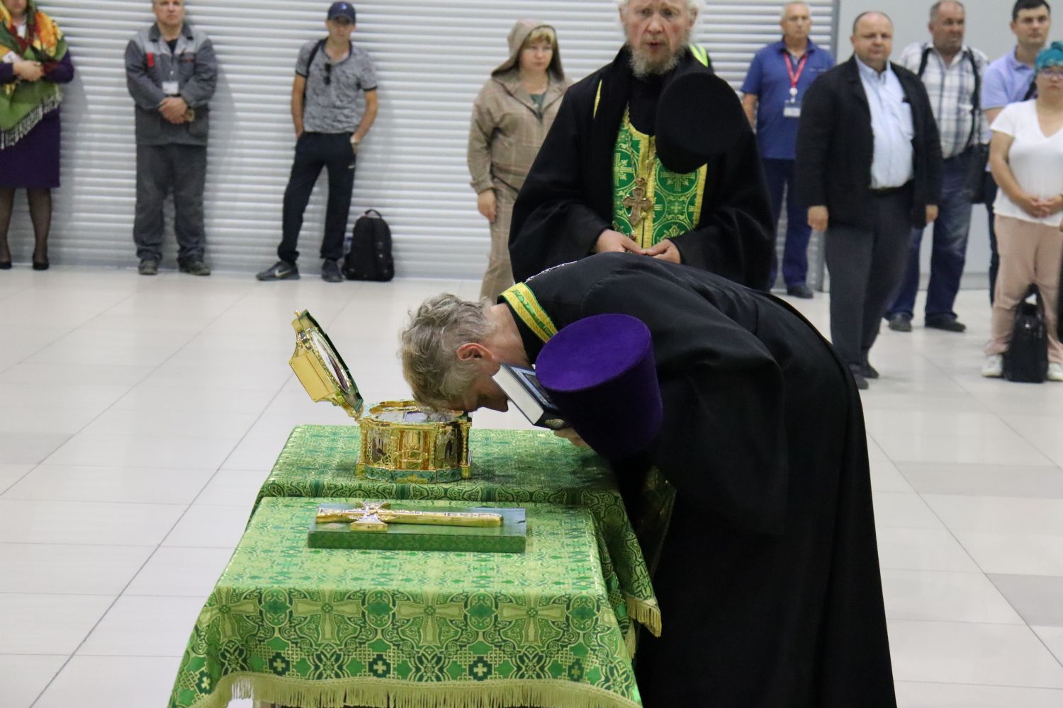 Перед святыми мощами в терминале аэропорта был совершен молебен, который возглавил настоятель Богоявленского храма города Артема протоиерей Иоанн Сергеев.