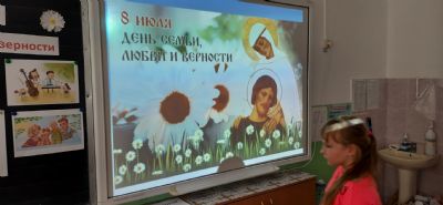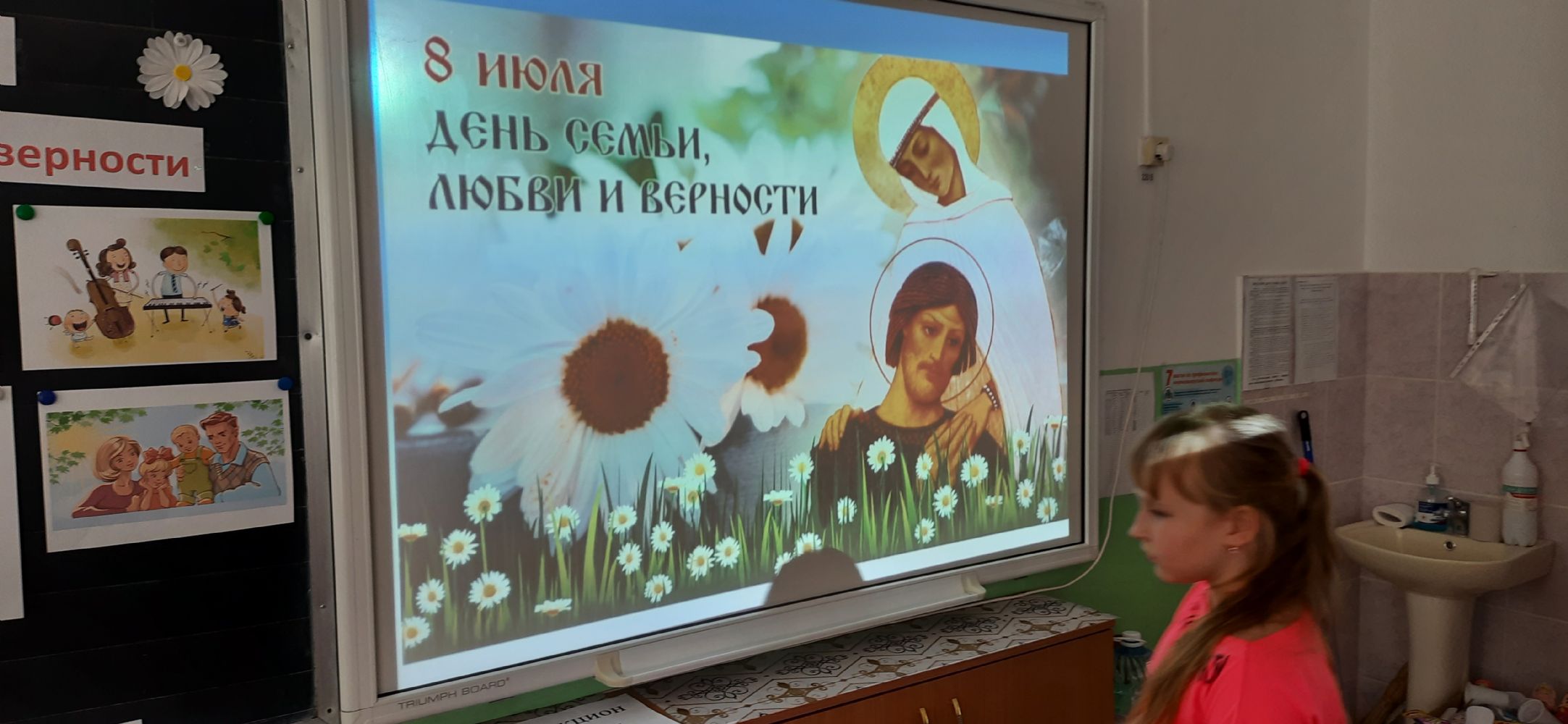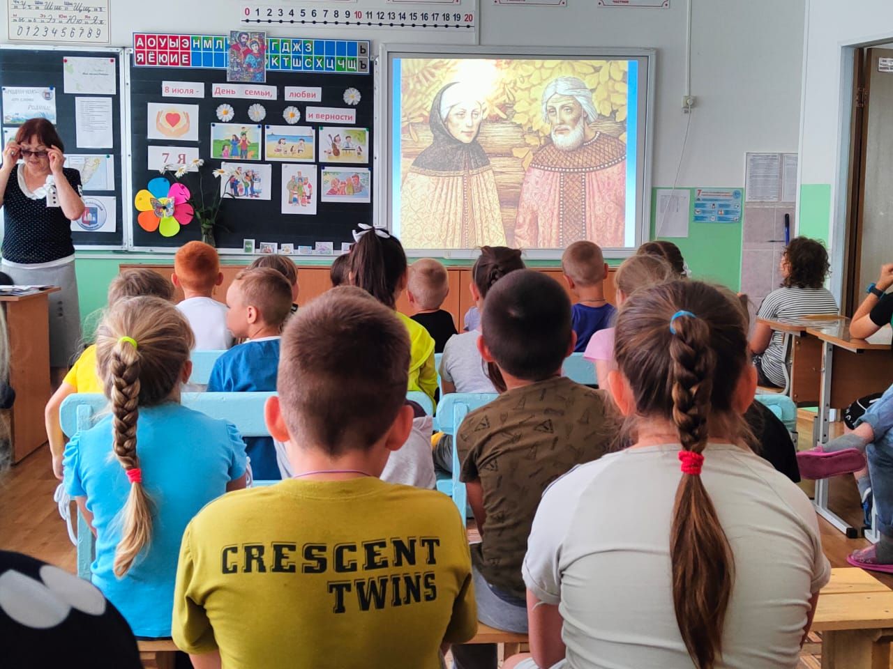 Дети пришкольного лагеря (40 человек) поссмотрели мультфильм, собирали бумажную ромашку на время, участвовали в викторине о семье, читали стихи, узнали, что такое февронька. Такие встречи оставляют неизгладимый след в душе ребенка.