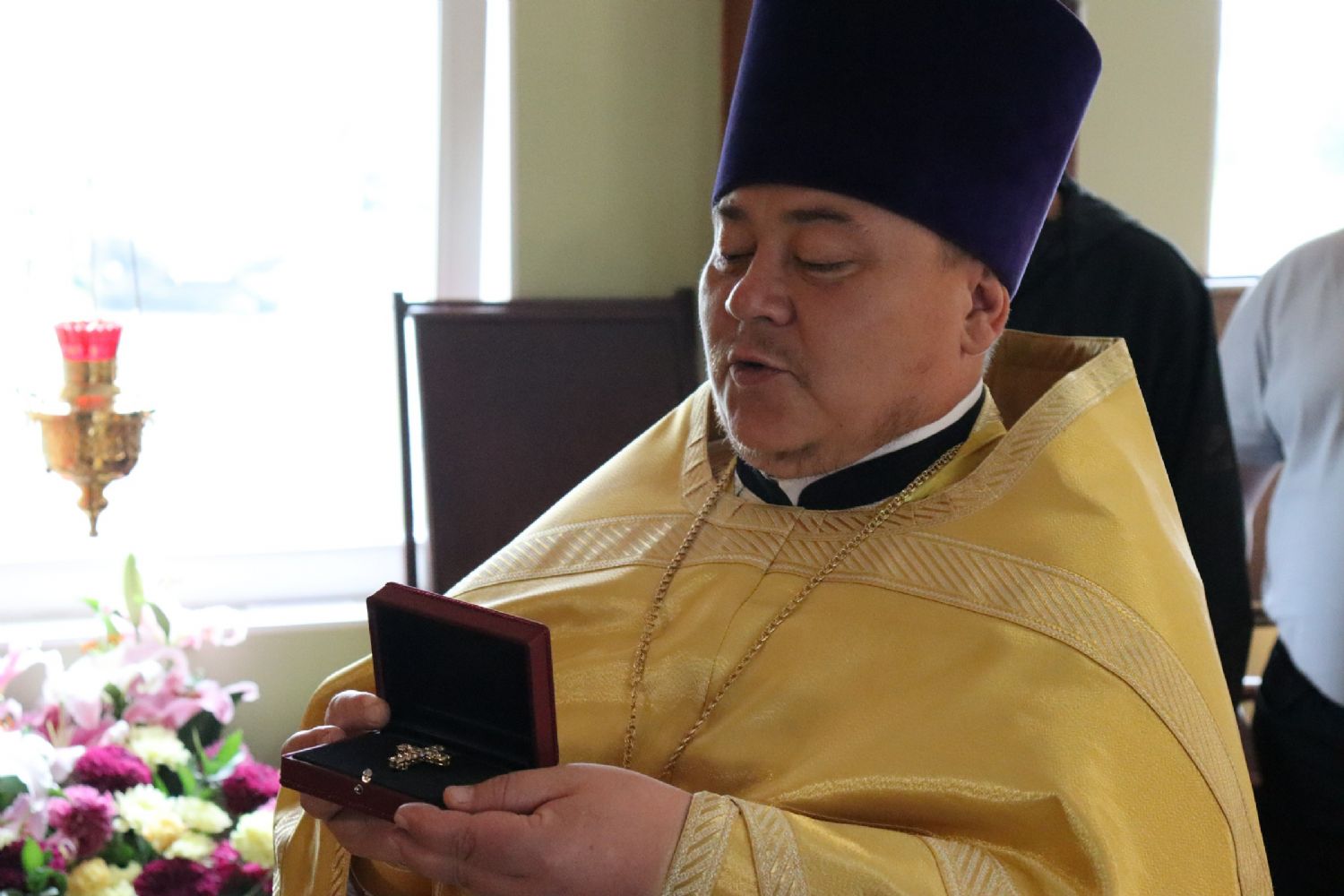 В завершение богослужения настоятель храма от имени клира и прихожан поздравил главу Приморской митрополии с праздником и преподнес букет цветов, а также крест на клобук.