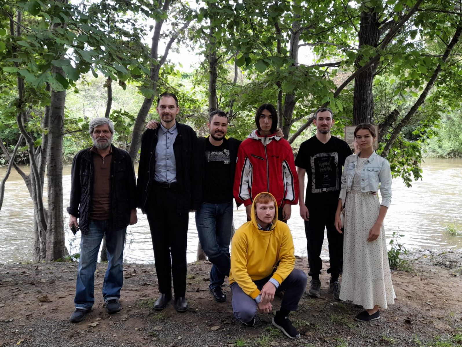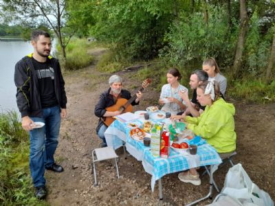 Обед на берегу Солдатского озера, пение под гитару песни "Любимый город" и других песен.