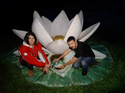 27. Полянка с качелями и скульптуры тигра и большого цветка лотоса на берегу озера лотосов.