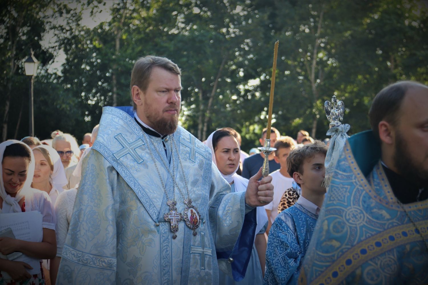 После пения великого славословия митрополит Владимир возглавил крестный ход с плащаницей Пресвятой Владычицы нашей Богородицы и Приснодевы Марии вокруг собора.