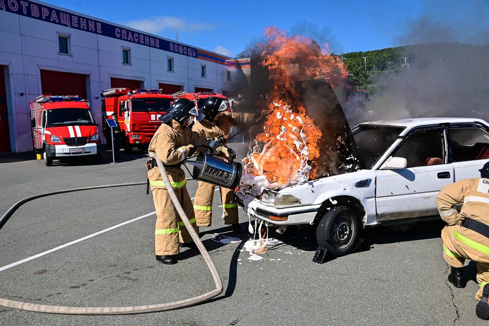 Присутствующим были представлены боевое развёртывание, забор воды из емкости с помощью мотопомпы и тушение условного пожара лафетным столом с применением раритетного мотоцикла «Урал» 1967 года и боевое развёртывание с использованием автоцистерны по деблокировке пострадавшего в дорожно-транспортном происшествии и тушении очага воздушно-механической пеной.
