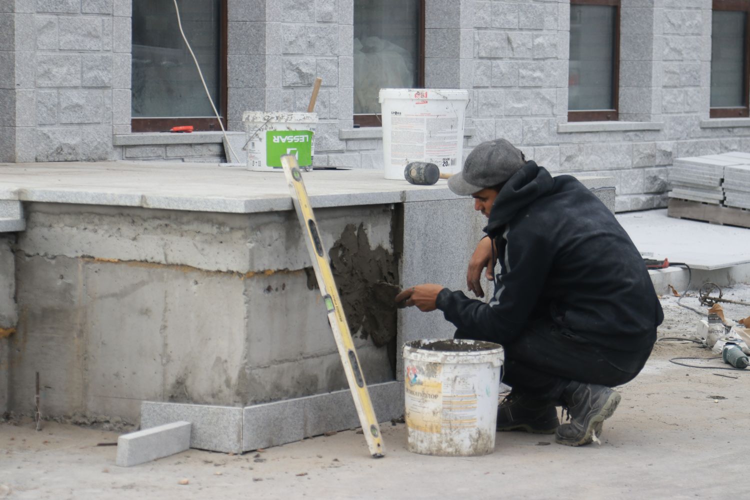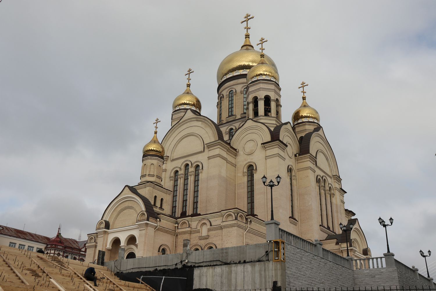 Продолжаются наружные работы по облицовке фасадов, лестниц и колонн натуральным камнем и ландшафтные работы на прилегающей к собору территории.