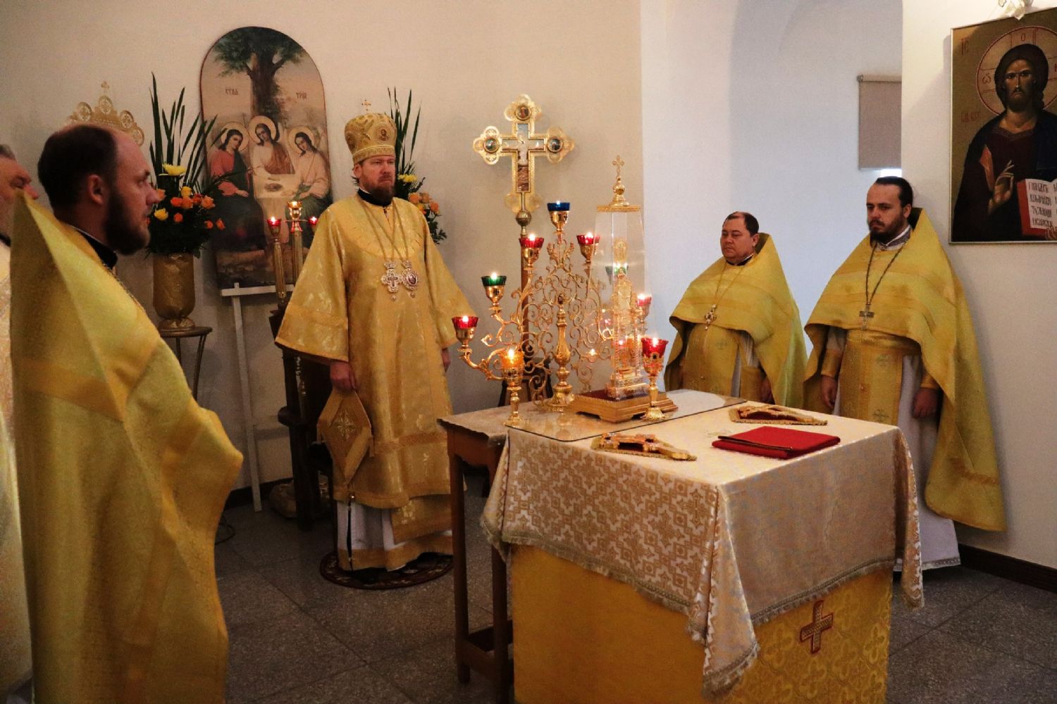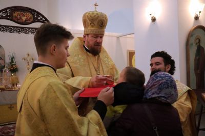 В завершение богослужения настоятель храма иеромонах Кирилл (Корниенко) поблагодарил владыку Владимира за архипастырский визит и преподнес букет цветов.