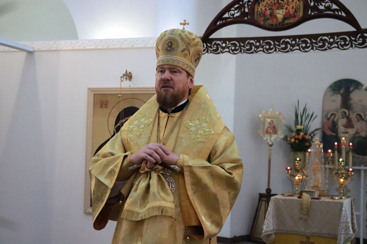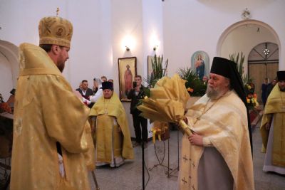 Митрополит Владимир обратился к молящимся с архипастырским словом, поздравил прихожан с престольным праздником первого храма прихода и воскресным днем, сугубо поздравил причастников с принятием Святых Христовых Таин, затем было возглашено многолетие в честь престольного праздника храма.