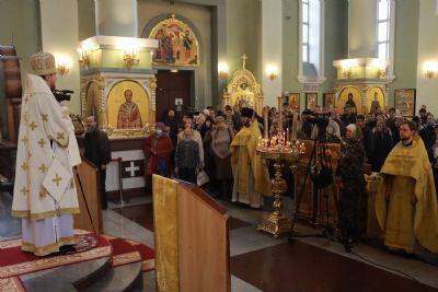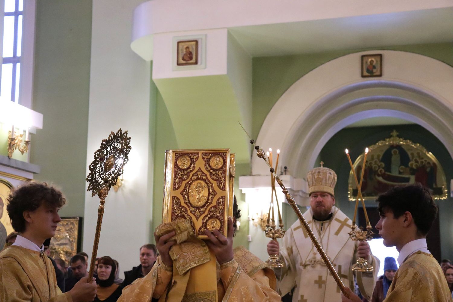 Его Высокопреосвященству сослужили: ключарь собора иерей Владимир Плотников; иерей Максим Точуков; иерей Виктор Архипов; ответственный за организацию архиерейских богослужений иерей Дионисий Ищенко.