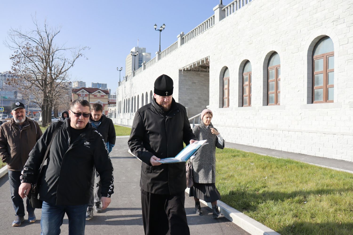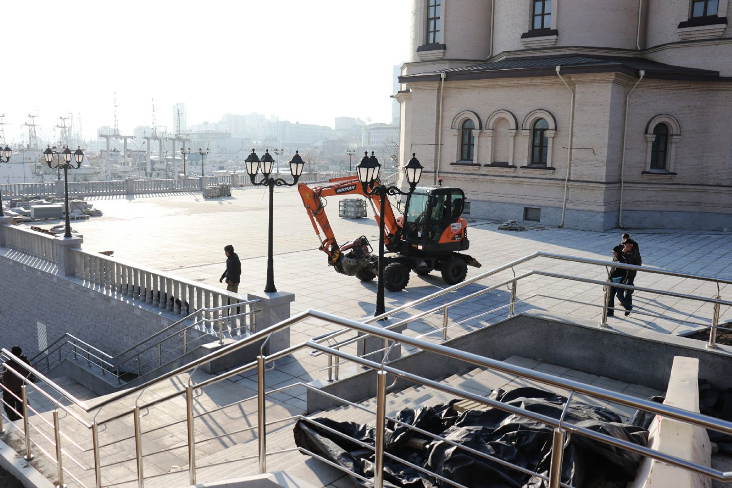 Был заслушан доклад о выполнении благоустройства территории, прилегающей к собору. Основной объем завершен, производится монтаж гранитной брусчатки тротуара от улицы Светланская.