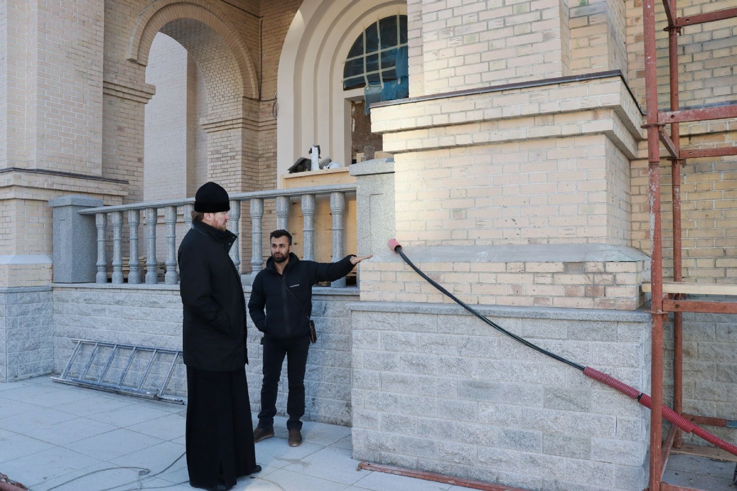 Продолжаются наружные работы по облицовке фасадов, лестниц и колонн натуральным камнем. Завершаются работы по благоустройству прилегающей к собору территории.