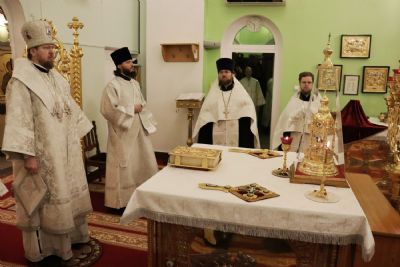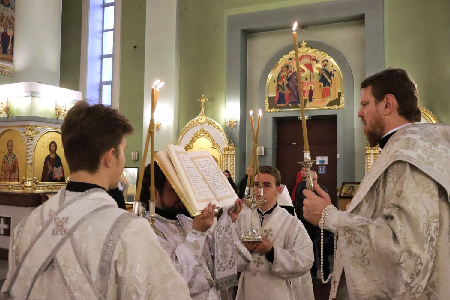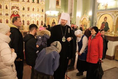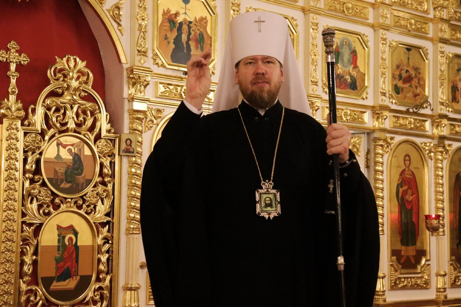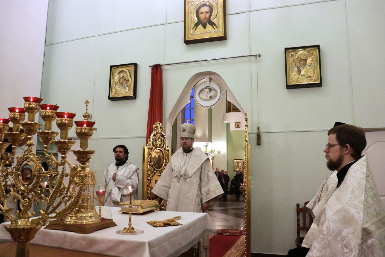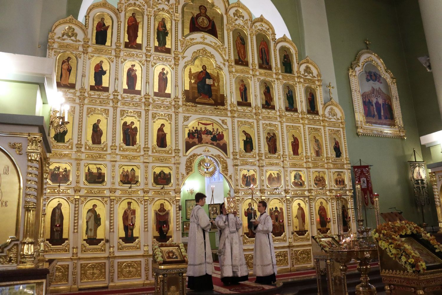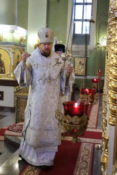 Его Высокопреосвященству сослужили: ключарь собора иерей Владимир Плотников; иерей Максим Точуков; иерей Виктор Архипов; ответственный за организацию архиерейских богослужений иерей Дионисий Ищенко.