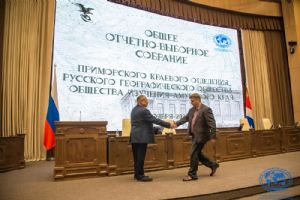 Владивосток. Отчетно-выборное собрание старейшей общественной организации - Приморского краевого отделения Русского географического общества - Общества изучения Амурского края (ПКО РГО - ОИАК) состоялось 19 ноября в здании правительства края.В нем участвовало 255 действительных членов отделения РГО, среди которых также находился викарий Владивостокской епархии епископ Уссурийский Иннокентий, к. ист. н., доцент кафедры теологии ДВФУ. По результатам тайного голосования председателем регионального отделения вновь избран Алексей Буяков. Общество утвердило отчет о работе ОИАК за последние 7 лет.