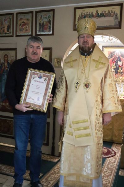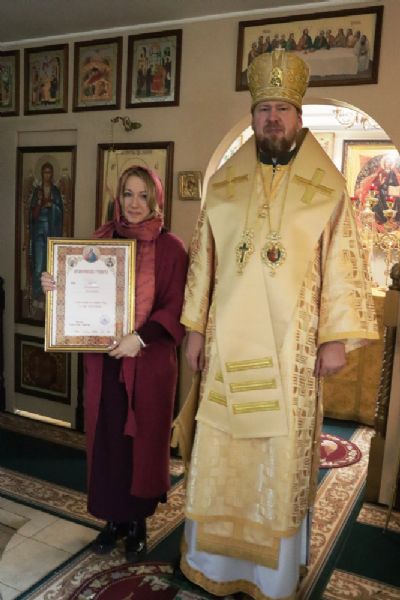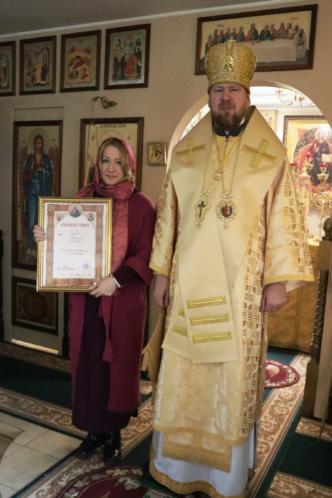 После чего состоялось награждение епархиальными наградами тружеников и благотворителей прихода: митрополит Владимир вручил юбилейные знаки «10 лет Приморской митрополии Русской Православной Церкви» О. Н. Григорьевой и О. М. Чеботовой; архиерейскими грамотами за усердные труды во славу Святой Церкви были награждены В. Ю. Марков и Ю. В. Бегунова.