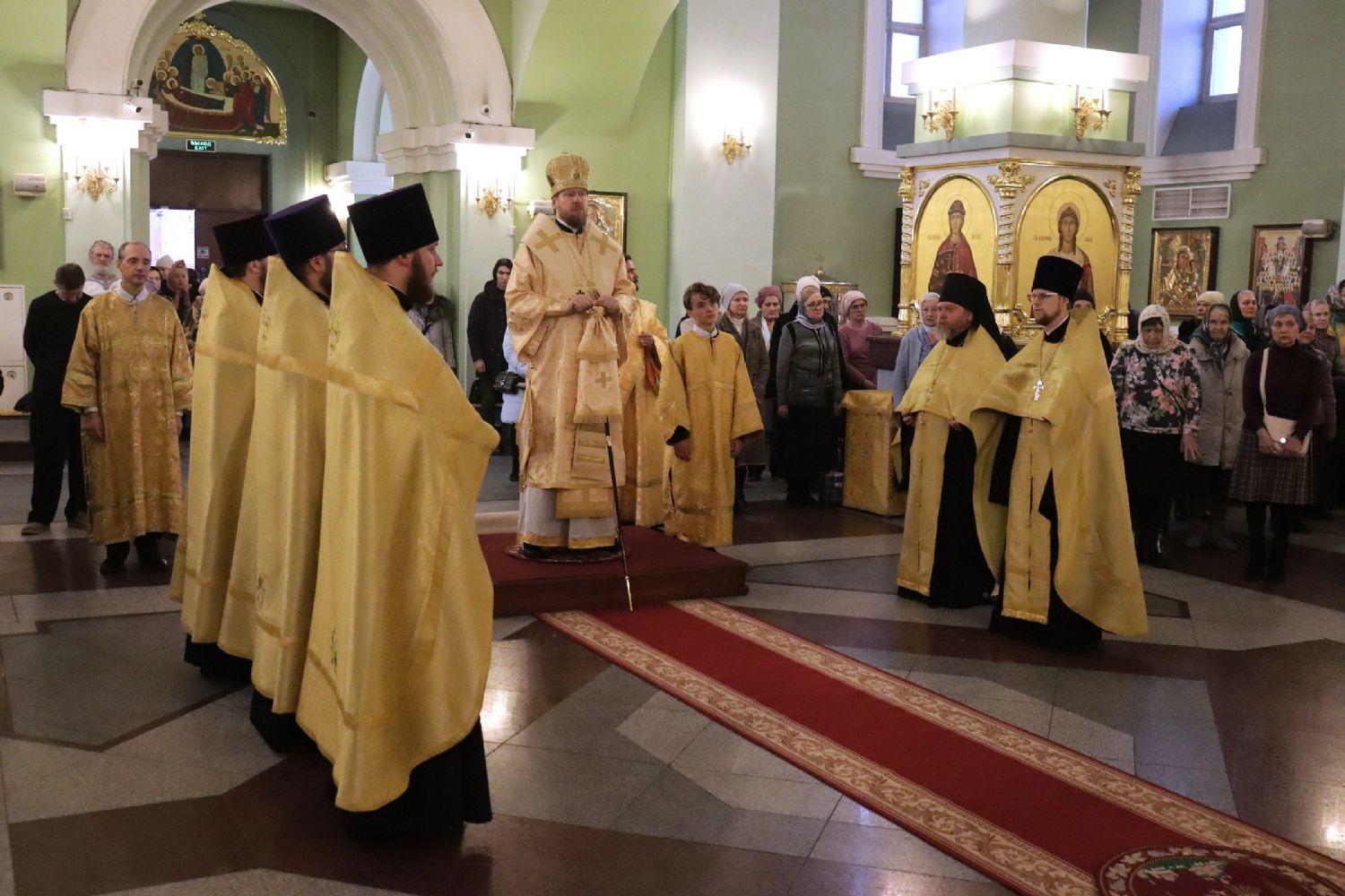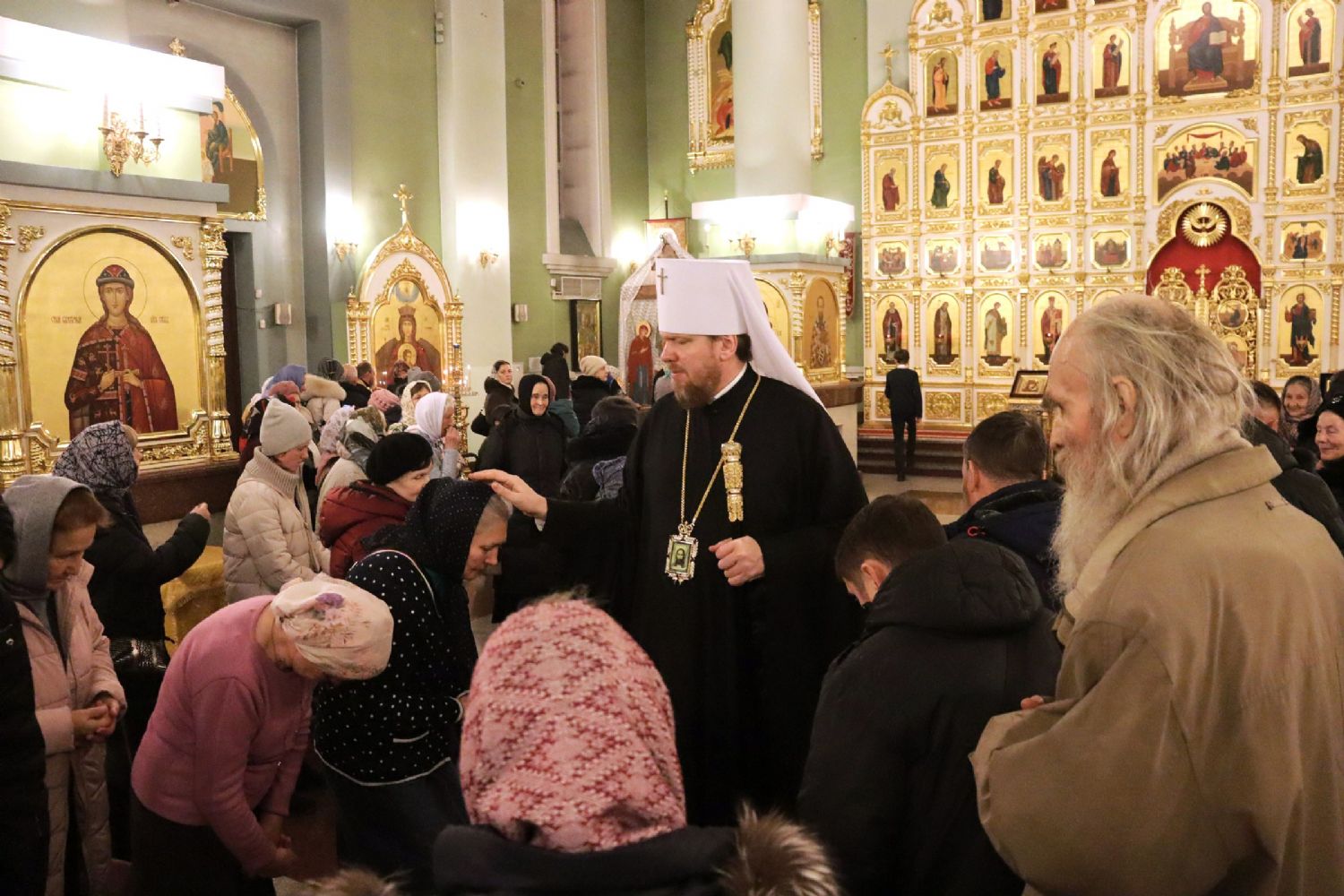 Его Высокопреосвященству сослужили: ключарь Покровского собора иерей Владимир Плотников, игумен Антоний (Каменчук); иерей Максим Точуков; иерей Виктор Архипов; ответственный за организацию архиерейских богослужений иерей Дионисий Ищенко.
