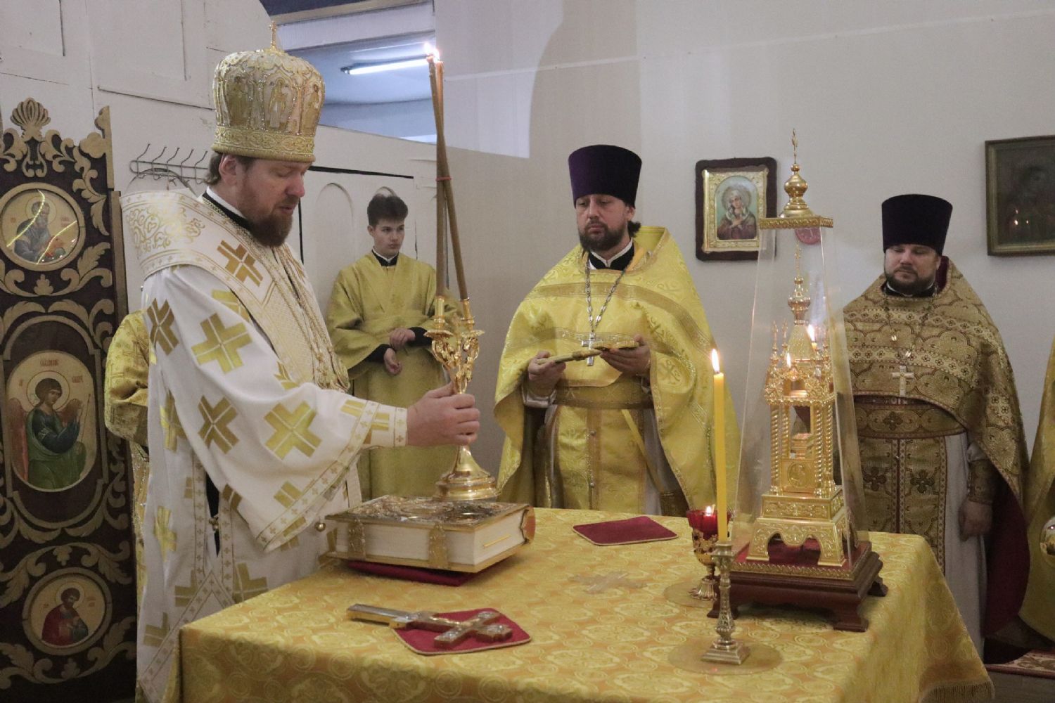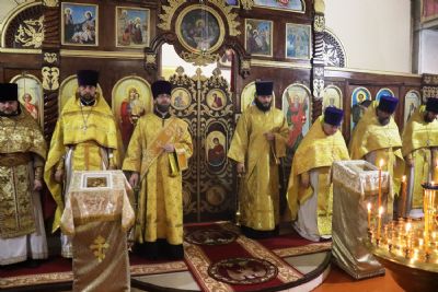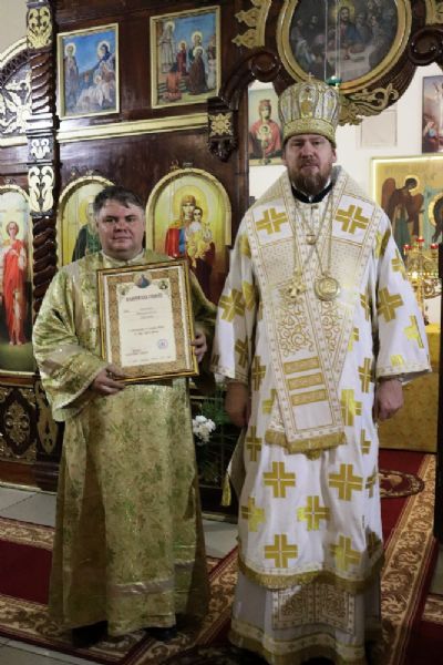 Его Высокопреосвященству сослужили благочинный I Владивостокского благочиния Владивостокской епархии, исполняющий обязанности благочинного II Владивостокского благочиния, настоятель храма святителя Спиридона Тримифунтского протоиерей Сергий Шуталев; настоятель храма Порт-Артурской иконы Торжества Пресвятой Богородицы г. Владивостока протоиерей Алексий Сабанский; настоятель Андреевского храма протоиерей Андрей Мельников; иерей Павел Иванчин; ответственный за организацию архиерейских богослужений в храмах Владивостокской епархии иерей Дионисий Ищенко; заместитель благочинного I Владивостокского благочиния иерей Михаил Тутаев.