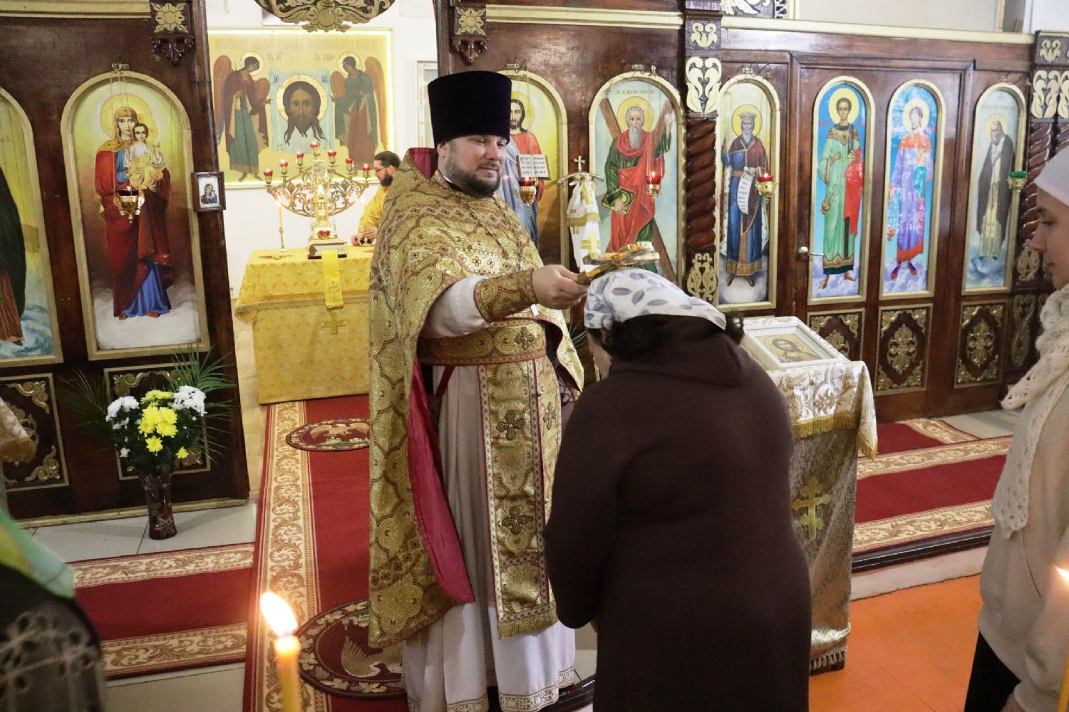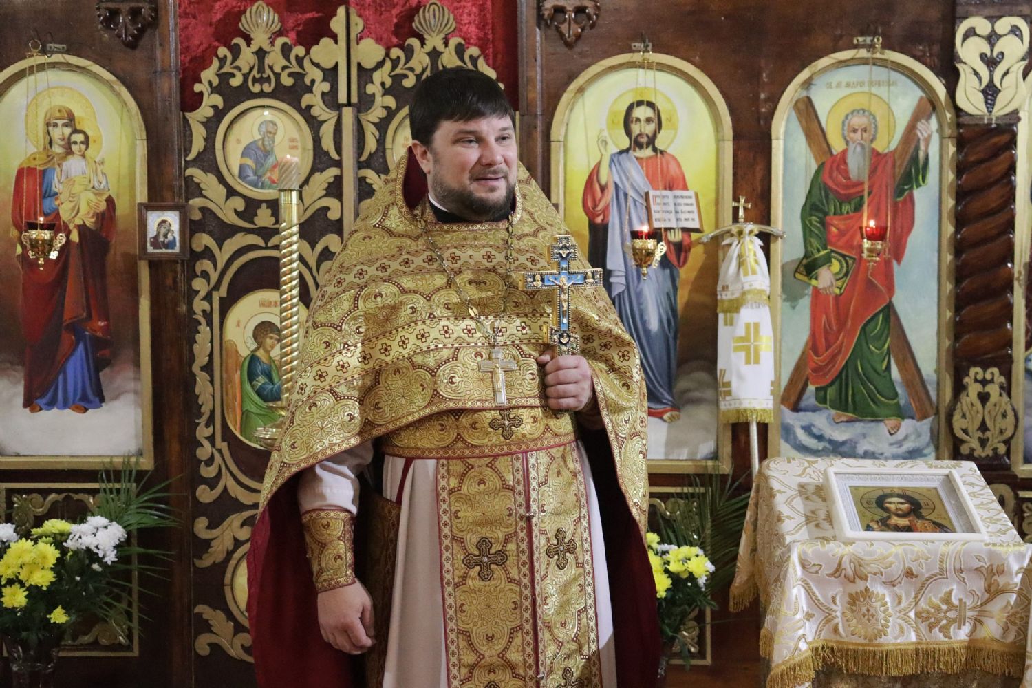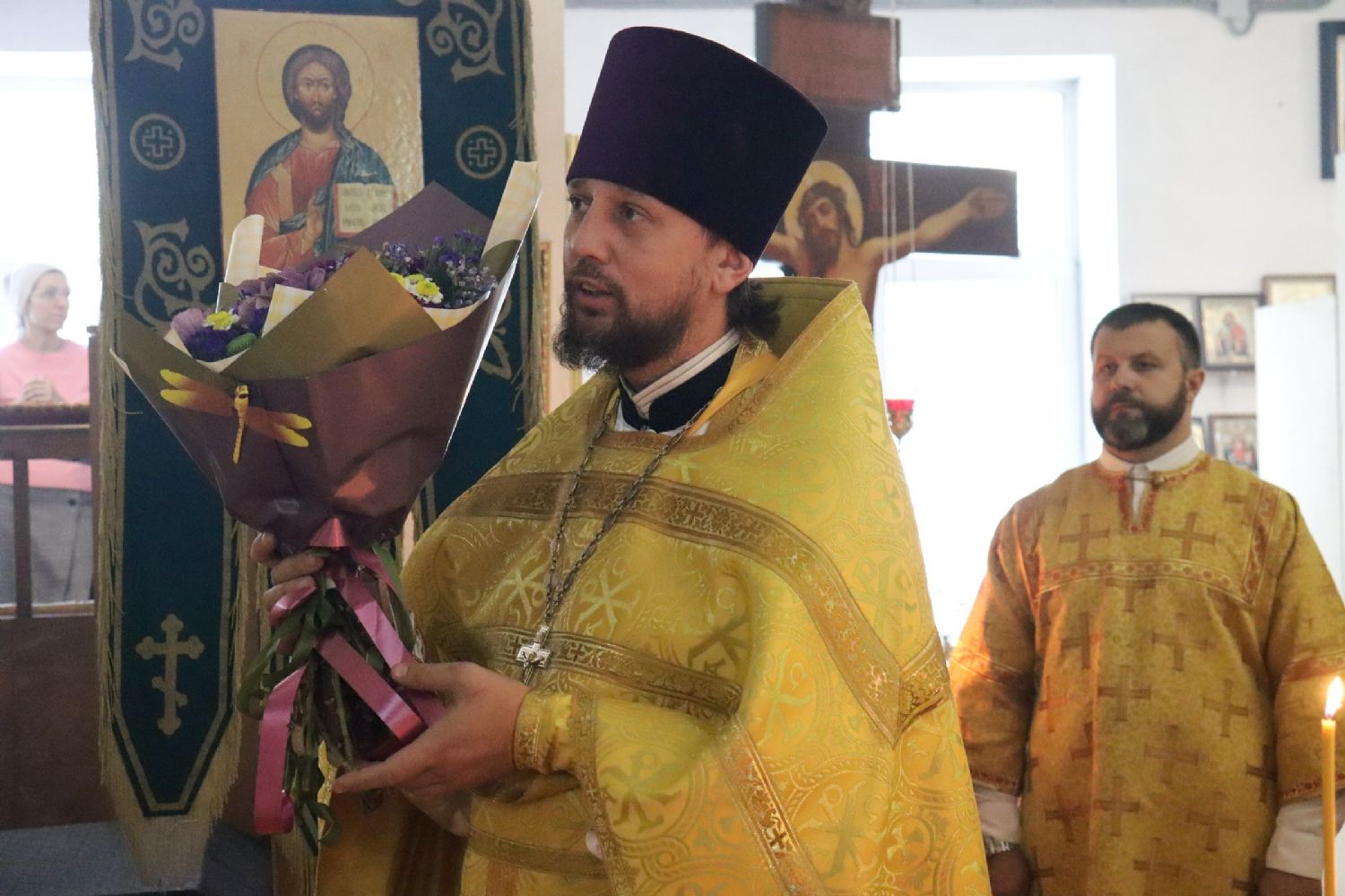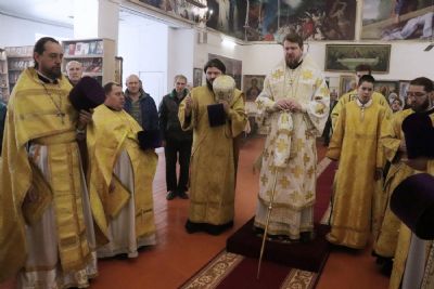 Настоятель храма святого апостола Андрея Первозванного иерей Андрей Мельников от имени клира и прихожан поблагодарил владыку за совместную молитву и преподнес ему букет цветов.