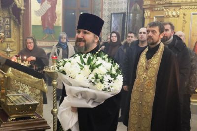 В завершение богослужения настоятель храма протоиерей Сергий Якутов поблагодарил митрополита Владимира за архипастырский визит и преподнес букет цветов.