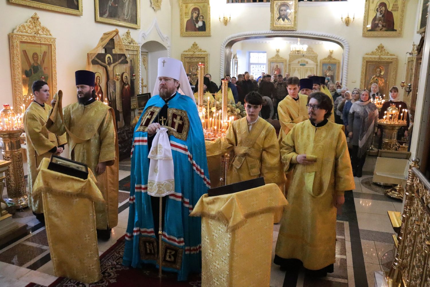 В завершение богослужения ключарь собора протоиерей Александр Талько поблагодарил владыку Владимира за архипастырский визит, поздравил с днем памяти святителя Николая, архиепископа Мир Ликийских, чудотворца, и преподнес букет цветов.