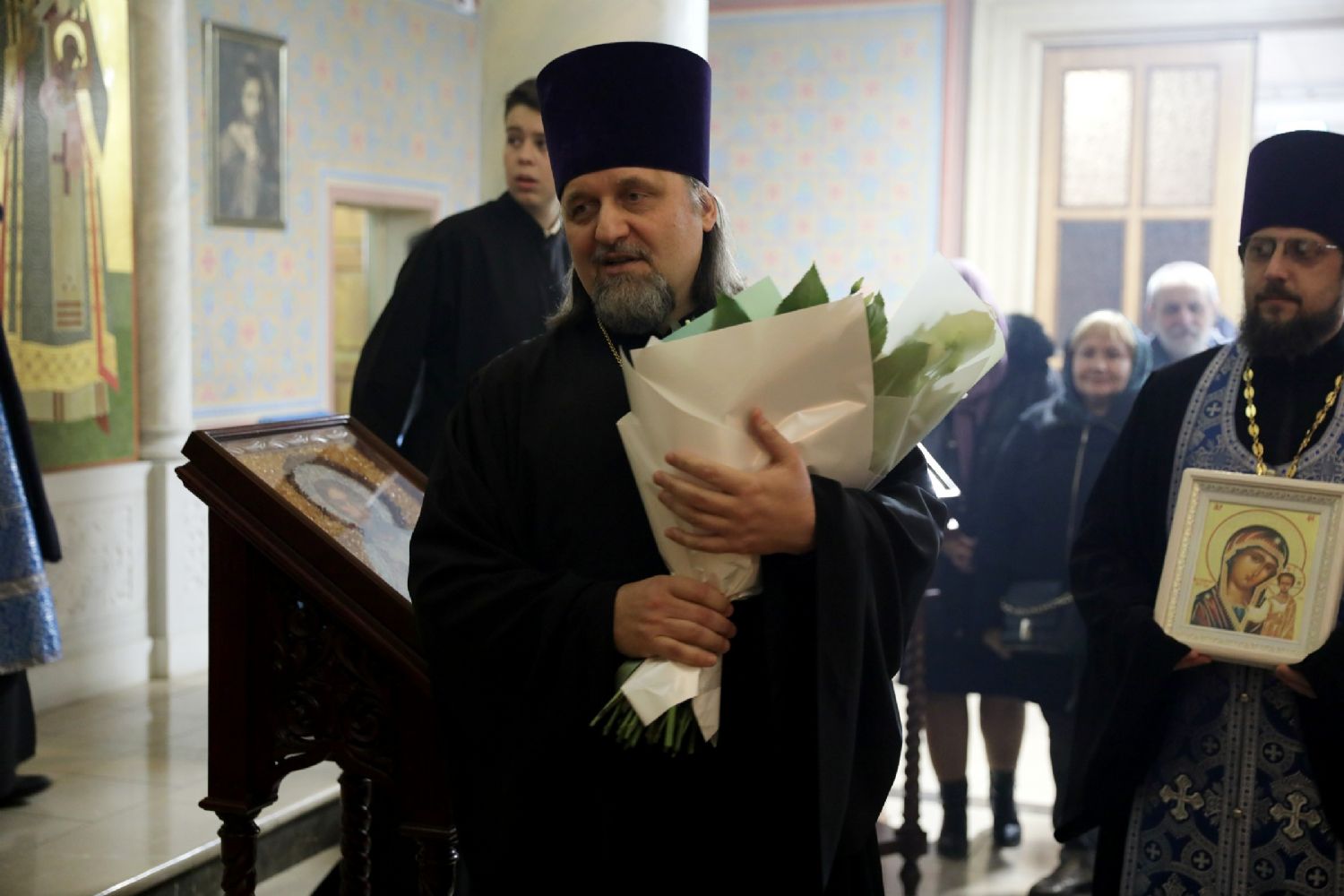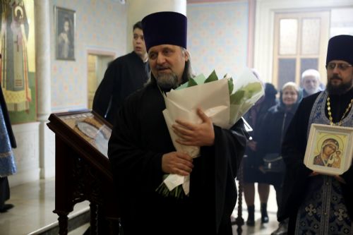В завершение богослужения настоятель храма протоиерей Ростислав Мороз от имени клира и прихожан поблагодарил владыку Владимира за архипастырский визит, поздравил его с кануном празднования Казанской иконы Божией Матери и преподнес ему букет цветов.