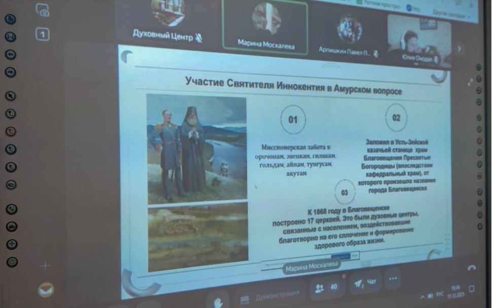 Далее выступила студентка Центра М.В. Москалёва с презентацией «Святитель Иннокентий Московский (Вениаминов) и значение его трудов для Православия». Студентка рассказала о жизни и миссионерской деятельности святителя, акцентируя внимание на его вкладе в развитие Православия на Дальнем Востоке и актуальности его наследия для современного образования.