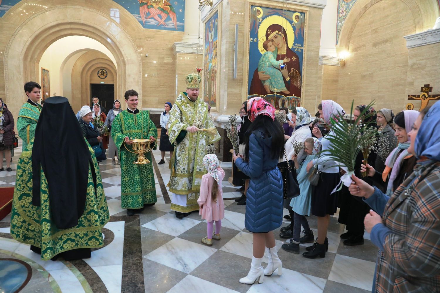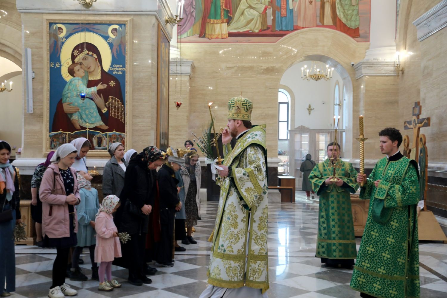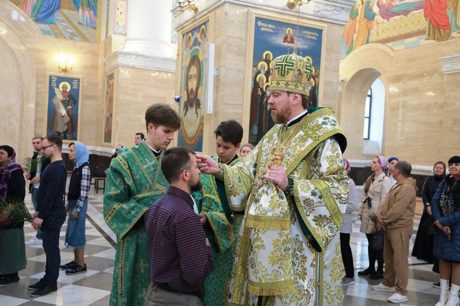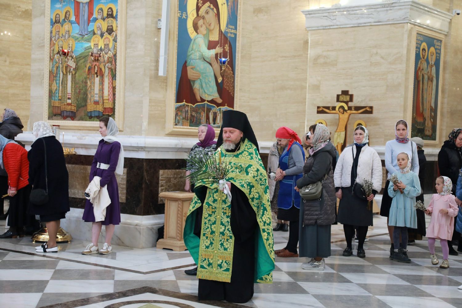 После чтения Святого Евангелия владыка Владимир совершил чин освящения вербных ветвей (ваий) и помазание верующих освященным елеем.