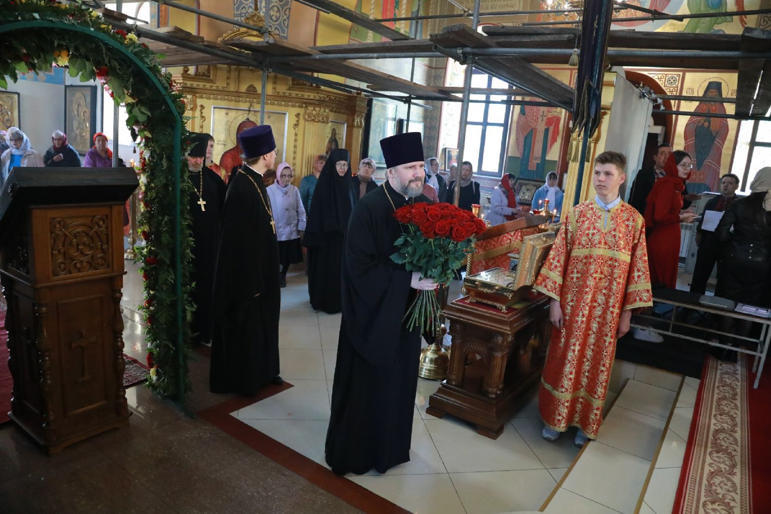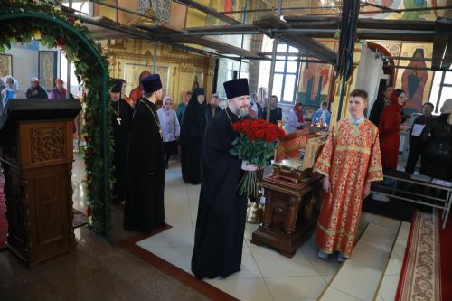В завершение богослужения настоятель храма протоиерей Сергий Якутов от имени клира и прихожан поблагодарил владыку Владимира за архипастырский визит, поздравил со Светлым Христовым Воскресением и преподнес букет цветов.
