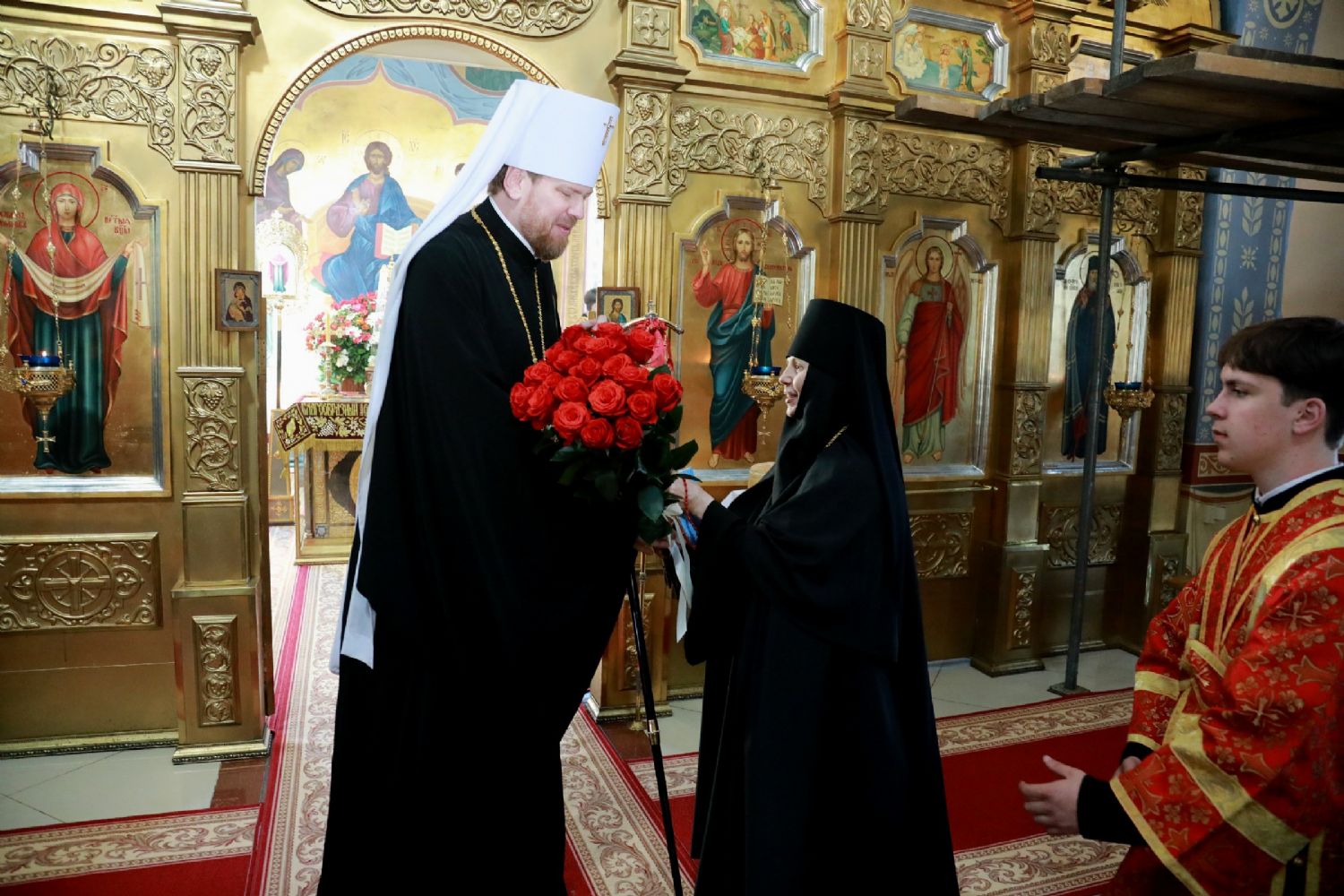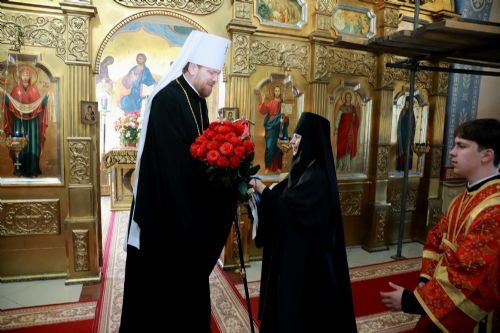 Затем со словами поздравления с праздником Святой Пасхи к главе Приморской митрополии обратилась настоятельница женского монастыря Казанской иконы Божией Матери п. Раздольное игумения Феодосия (Байкова) и преподнесла ему букет цветов.