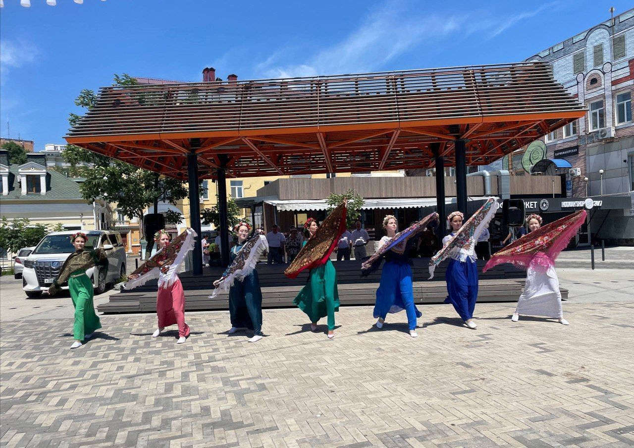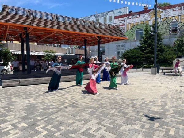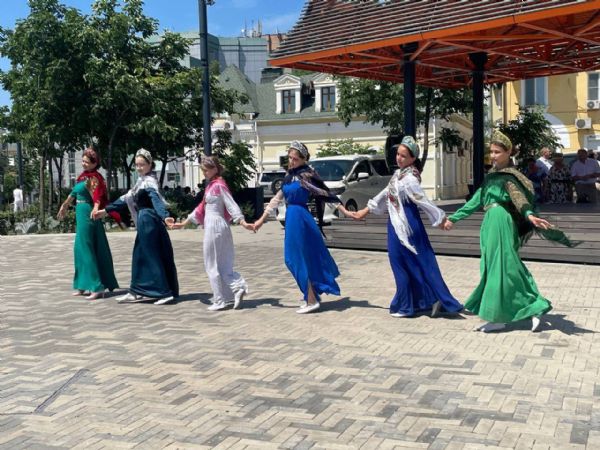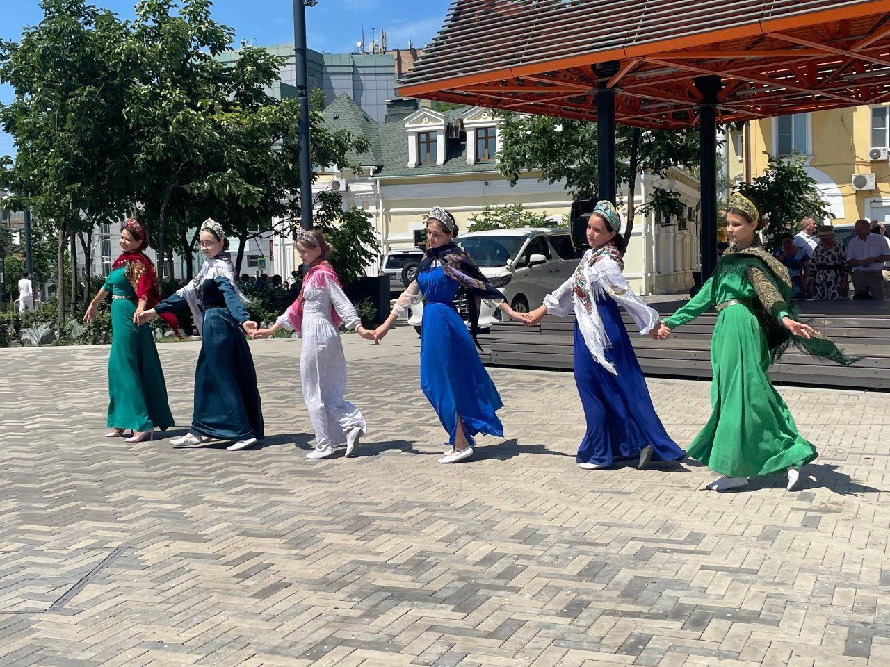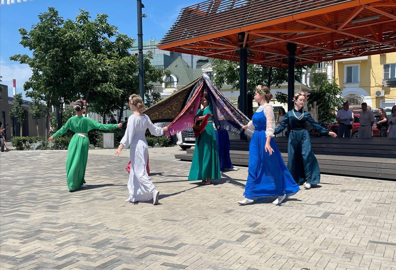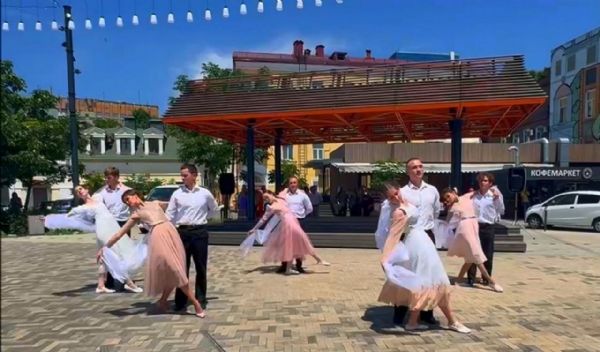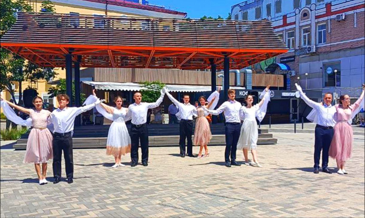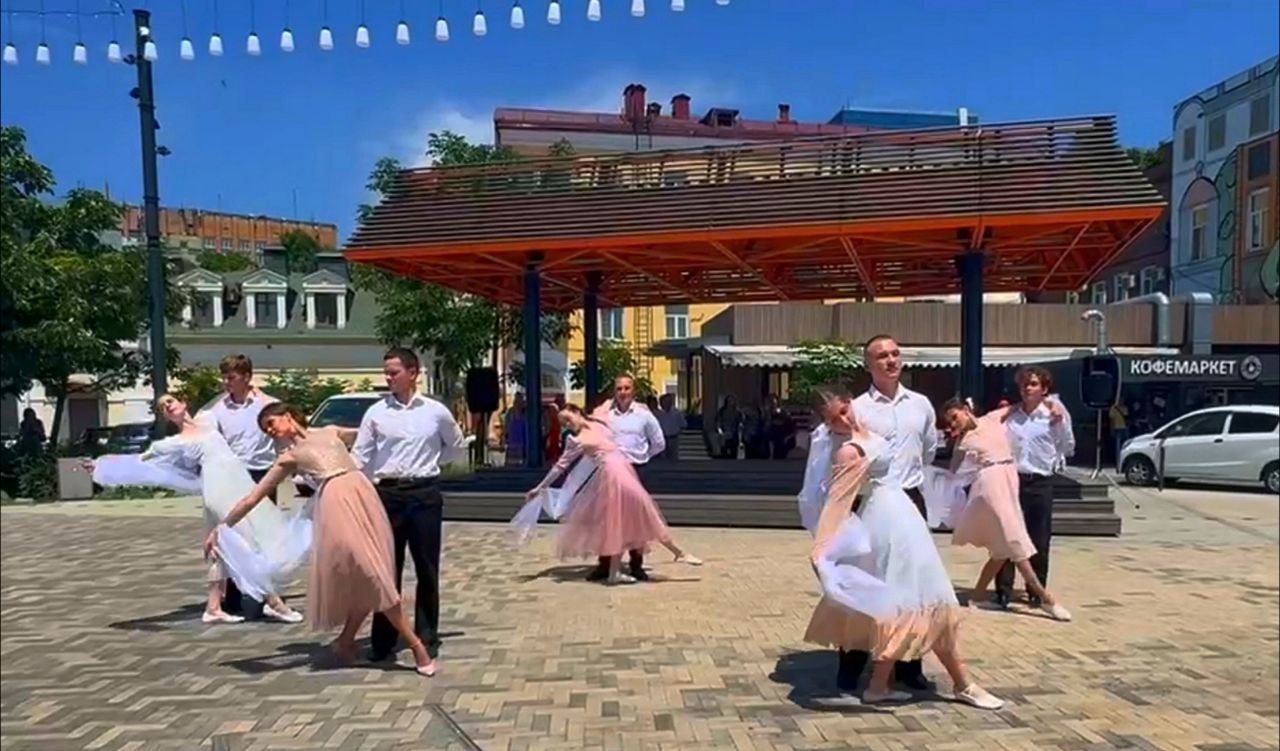 На одной из центральных улиц города молодые артисты представили три хореографические постановки. Две из них созданы в лучших традициях русского народного танца, с использованием ярких костюмов, и напомнили зрителям о глубоких корнях и красоте отечественной культуры.