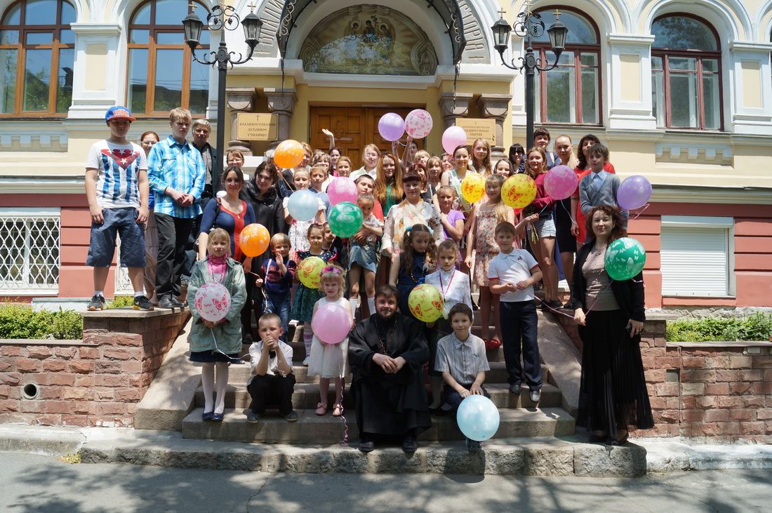 После концерта все вместе сфотографировались на память на крыльце Епархиального управления. Как отметил отец Даниил, с подъёма по этим ступенькам начинается путь каждого ученика в воскресную школу. Выпускники отпустили в голубое небо воздушные шары, и вместе с преподавателями и батюшкой отправились в трапезную на традиционное чаепитие с пирогами за дружескими беседами.