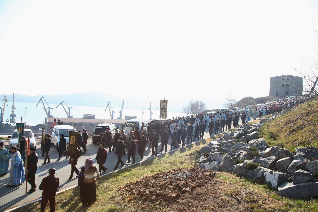 Затем от Казанского кафедрального собора архиереи митрополии, благочинные епархиальных округов, настоятели и клир храмов и сотни участников торжеств – жители Находки и других приморских городов – прошли общегородским Крестным ходом с Казанской иконой Божией Матери и ковчежцем с частицей мощей преподобного Сергия Радонежского.