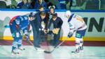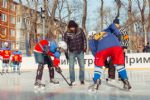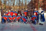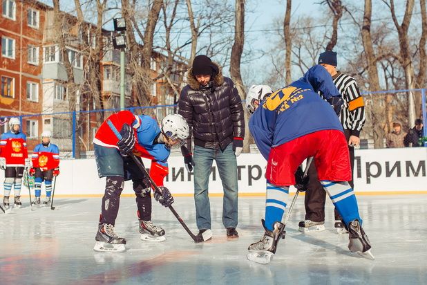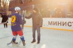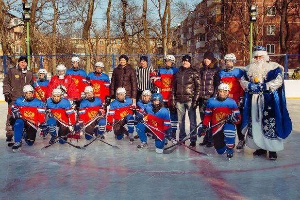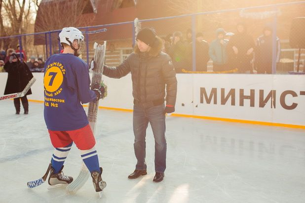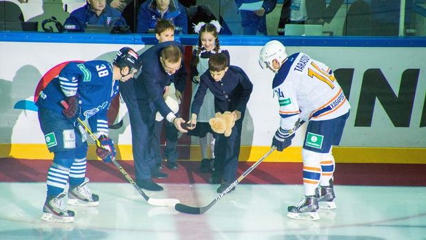 Далее команда «Адмирал» отправилась на лёд хоккейной коробки, которую построили в гимназии в минувшем году. Илья Зубов, Энвер Лисин и Алексей Угаров вручили юным хоккеистам 24 новенькие клюшки. Ребята тотчас их испробовали в товарищеском матче. Капитан "Адмирала" Илья Зубов произвел символическое вбрасывание перед началом встречи.