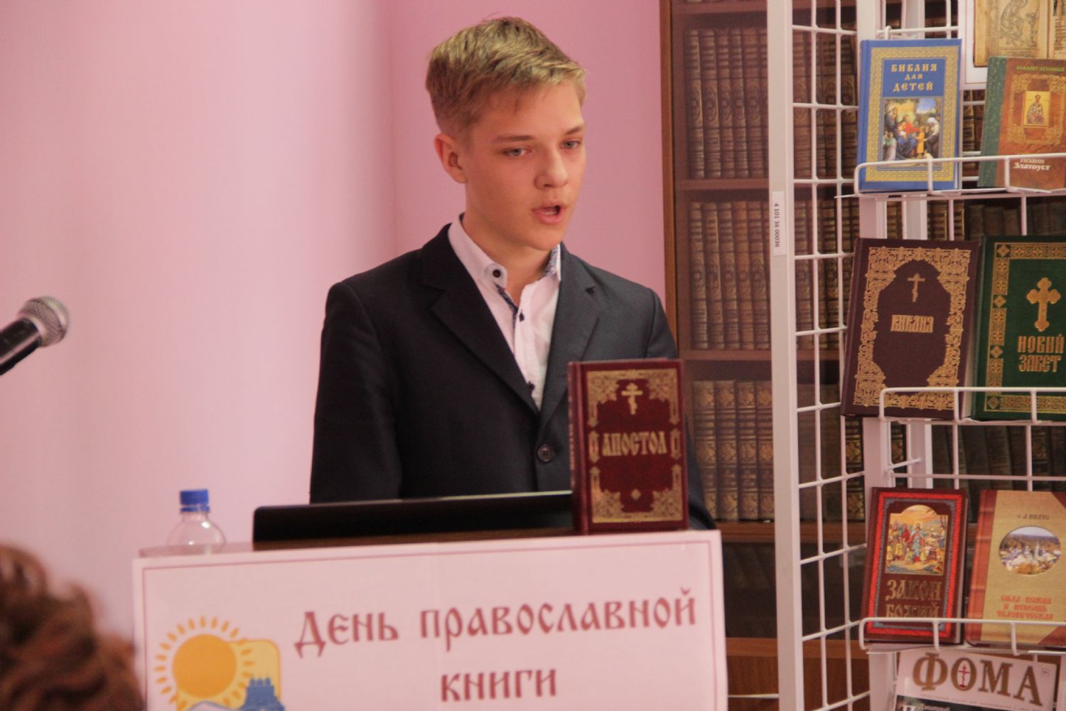 - На празднике было зачитано Слово Святейшего Патриарха к Дню Православной книги. Затем прозвучали доклады: ученик 9 класса школы №25 Максим Морев подготовил выступление о первопечатнике Иване Федорове, а студентка факультета начального образования ДВФУ Марина Никишова представила доклад на тему «Художественные особенности книги «Апостол».
