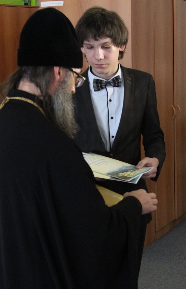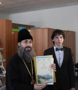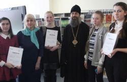 Его Преосвященство вручил призерам, конкурсантам и педагогам, которые их подготовили – порядка 60 наград – сертификаты, дипломы, грамоты и благодарности, а также иконы, видеодиски и экземпляры книги Высокопреосвященнейшего владыки Вениамина, митрополита Владивостокского и Приморского «Священная Библейская история».