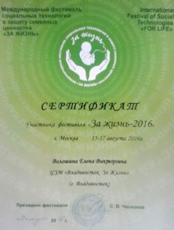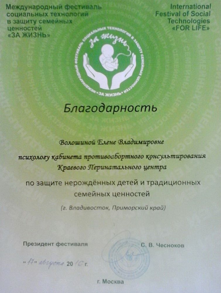 Деятельность психологов из Приморья была отмечена на фестивале Благодарностями и Сертификатам. Приморский край на фестивале представляют: психолог Приморского краевого перинатального центра (г.Владивосток) Елена Волошина; и психолог кабинета предабортного консультирования райбольницы с.Покровка, сотрудник центра помощи «Колыбелька» при Покровском храме села Покровка Октябрьского района Приморья Александра Барашкова.